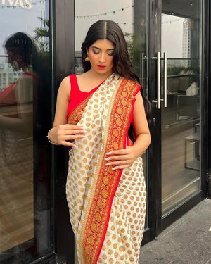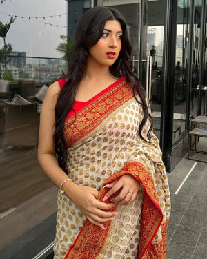 Drape yourself into this Authentic 'Banarasi Saree' traditionally woven in banarasi khaddi minzari georgette fabric from the weavers of 'Banaras' to dazzle everyone with your excellent ethnic and traditional look.
