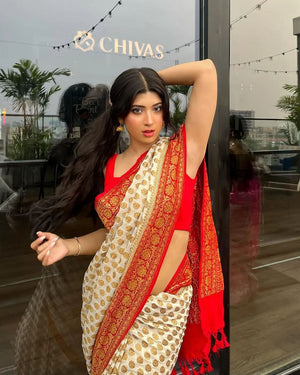 This khaddi georgette banarasi saree is more about being oneself in terms of style, these are designed with high-quality banarasi fabric. Hanfi Handicraft is a fashion label that stands for quality and style. It is founded on creativity.