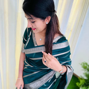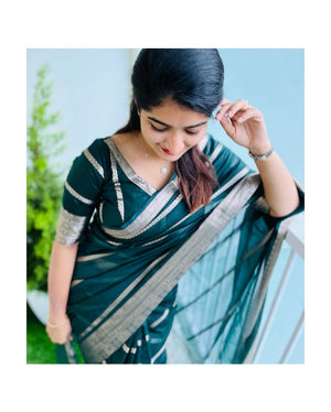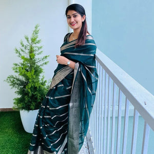 Banarasi Woven Soft Organza Stripe Pattern Saree Bottle Green | For Every Occasion & Festivals