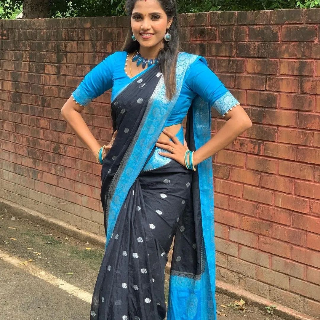 Black Blue Banarasi Semi Georgette Soft Saree with Contrast Border Silver Zari