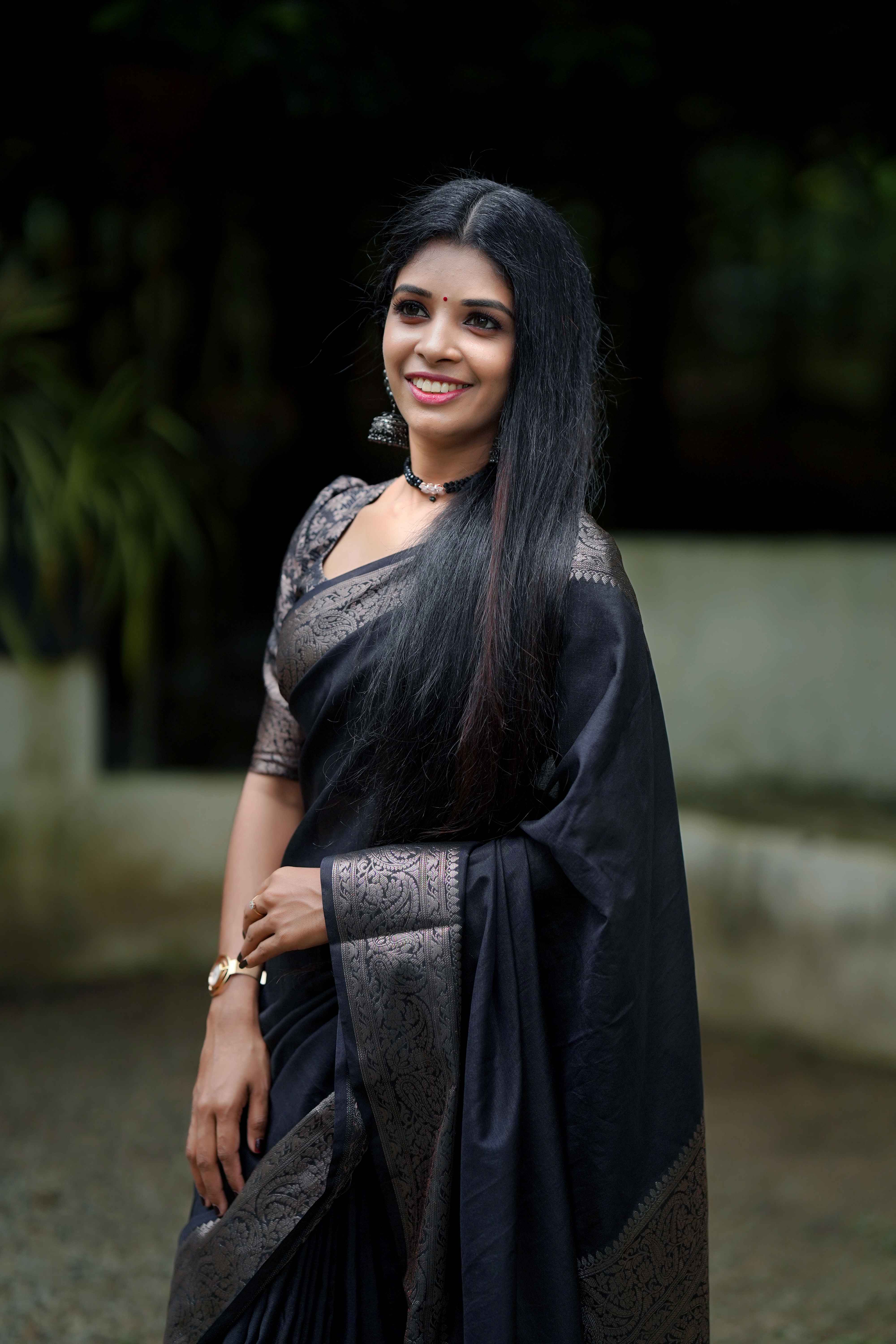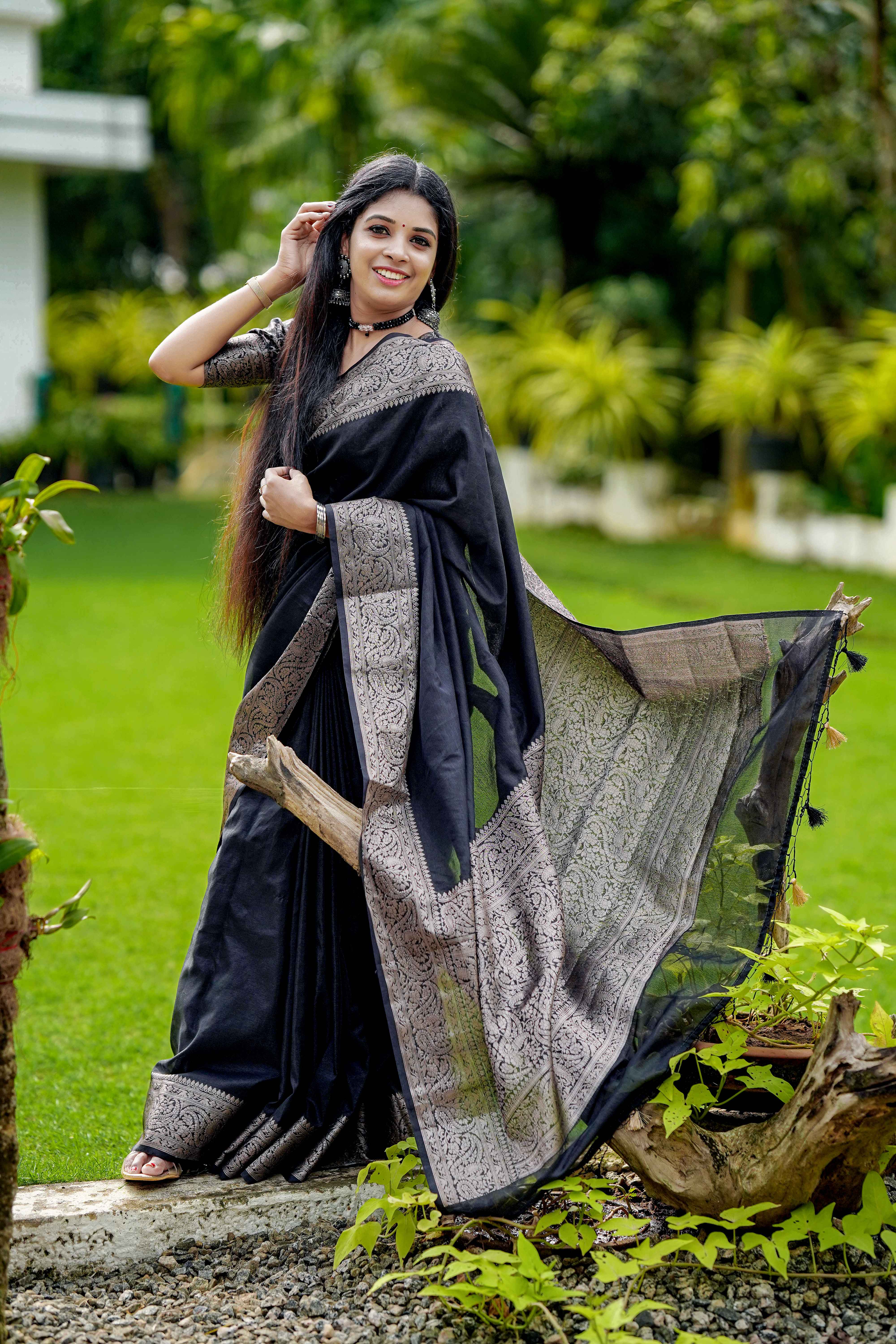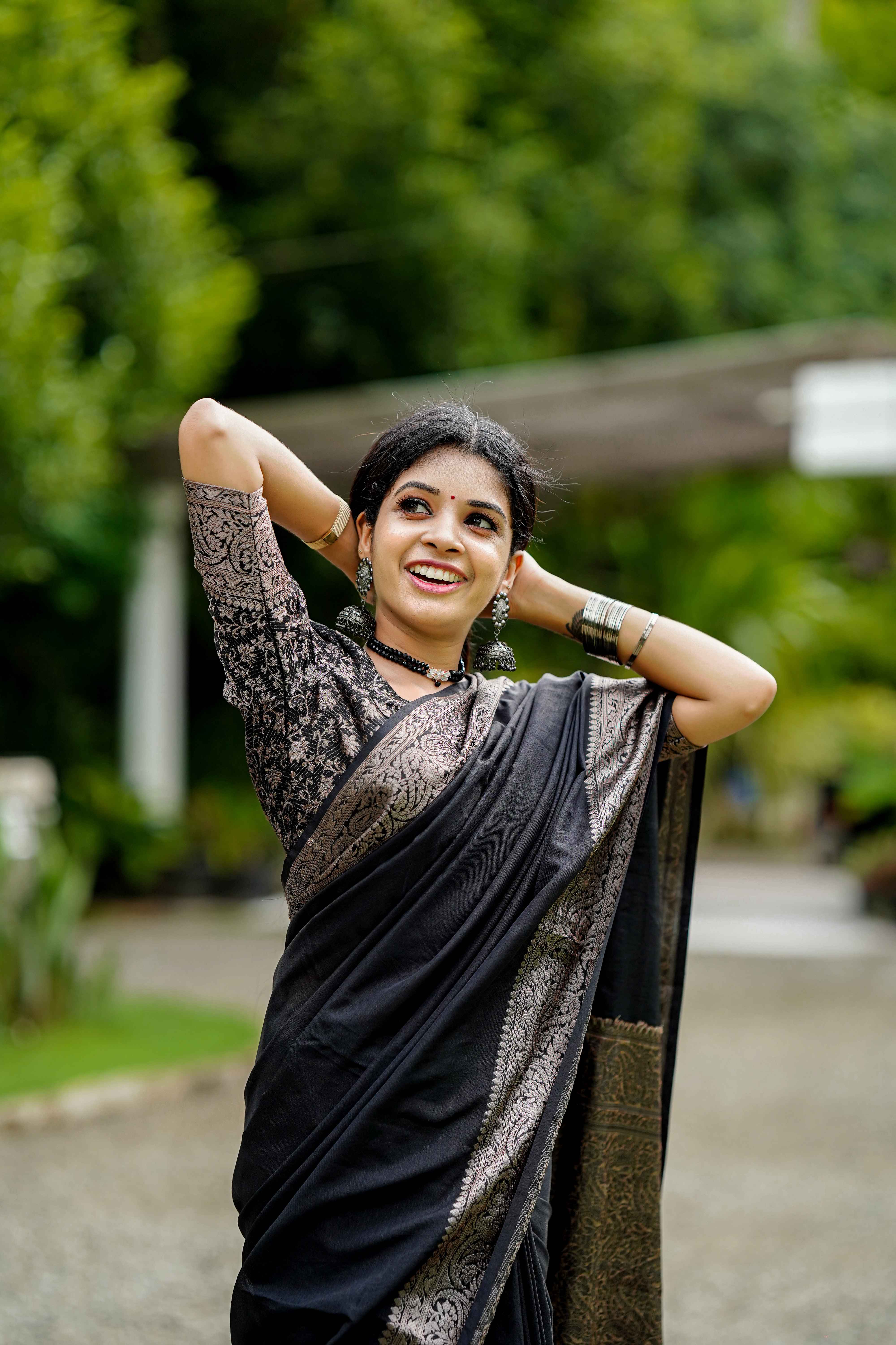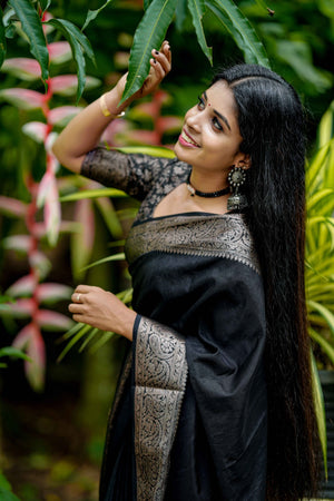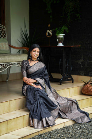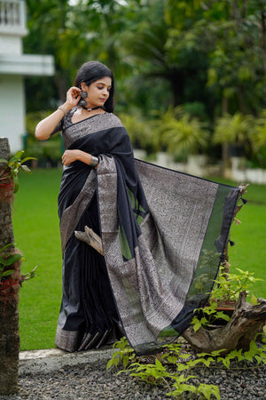Black Classic Banarasi Woven Soft Saree with Antique Zari Borders