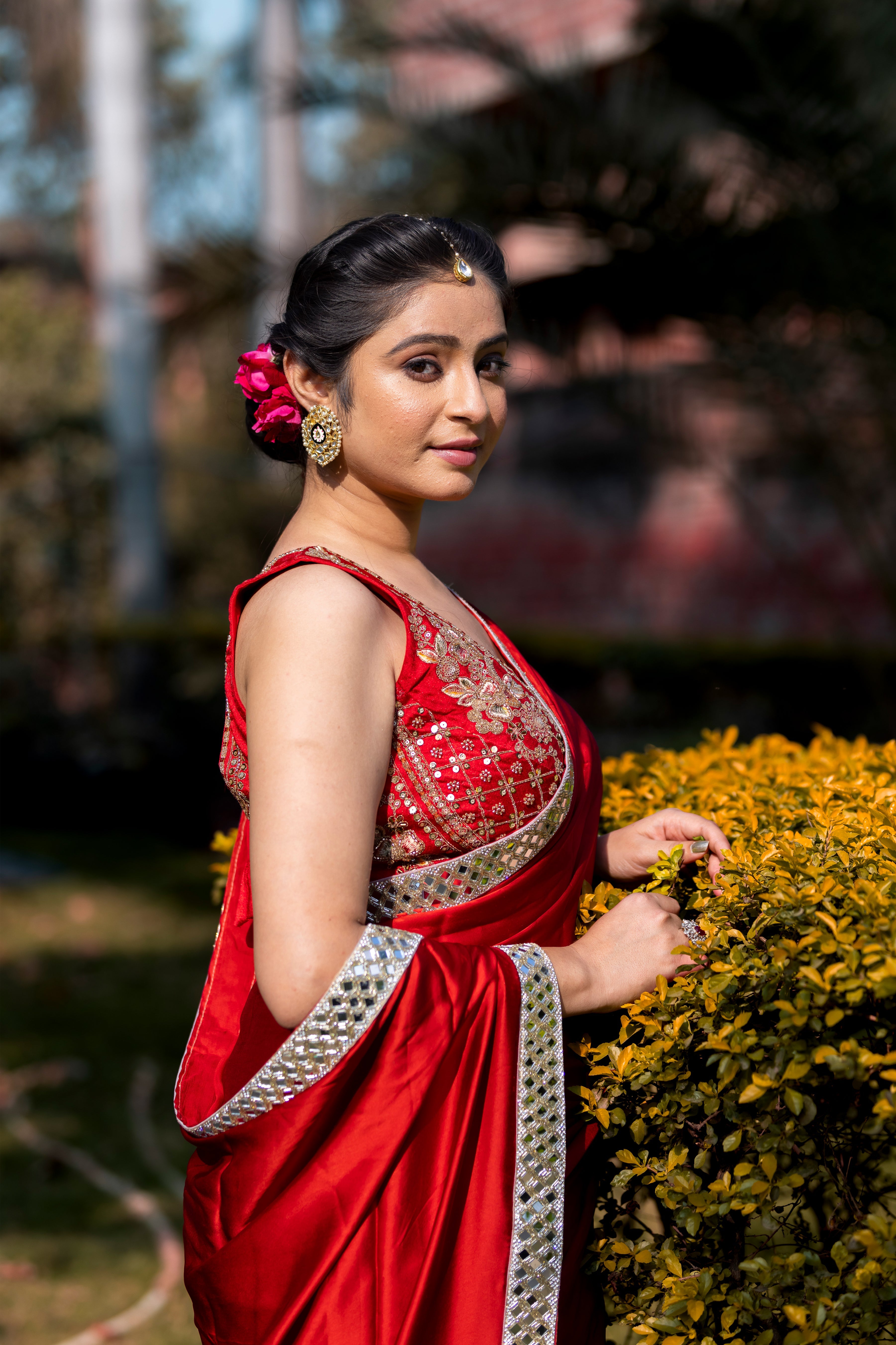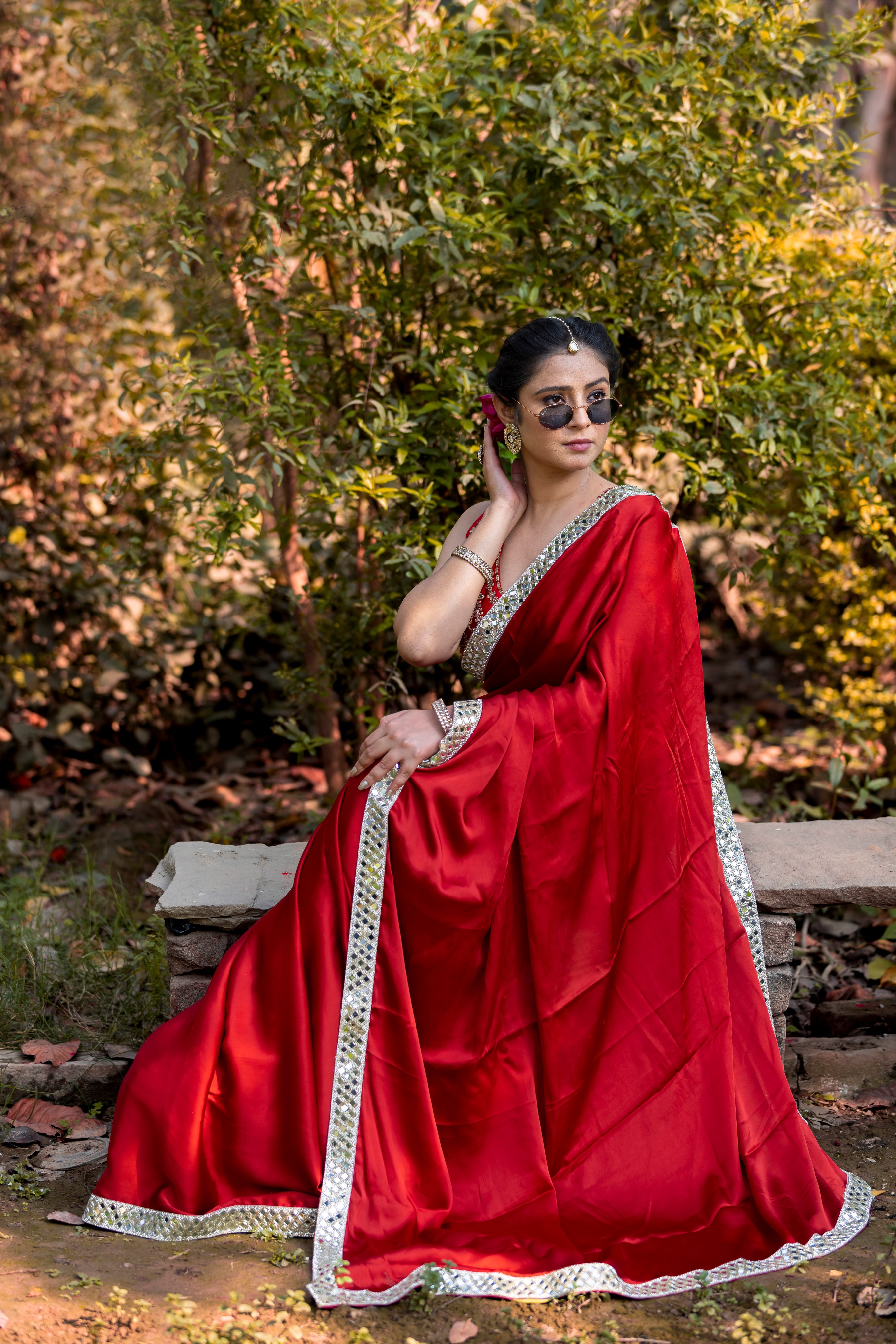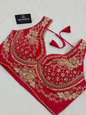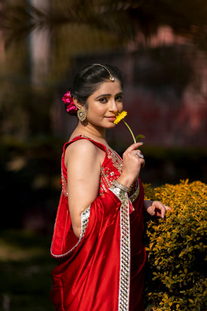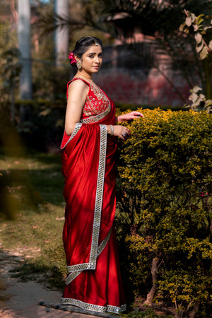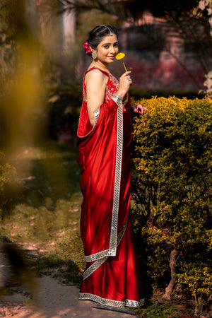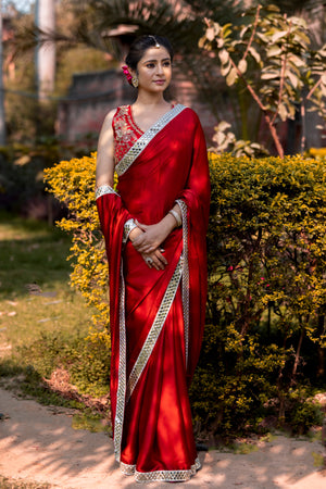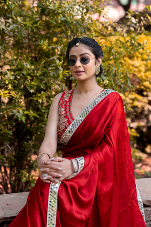 Bold Red Designer Mashru Satin Silk Mirror Work Saree with Blouse Free Size