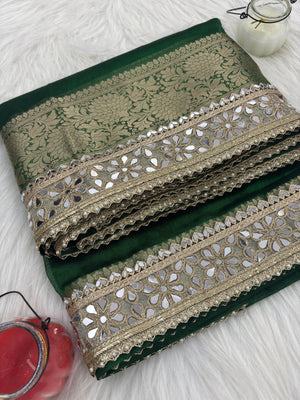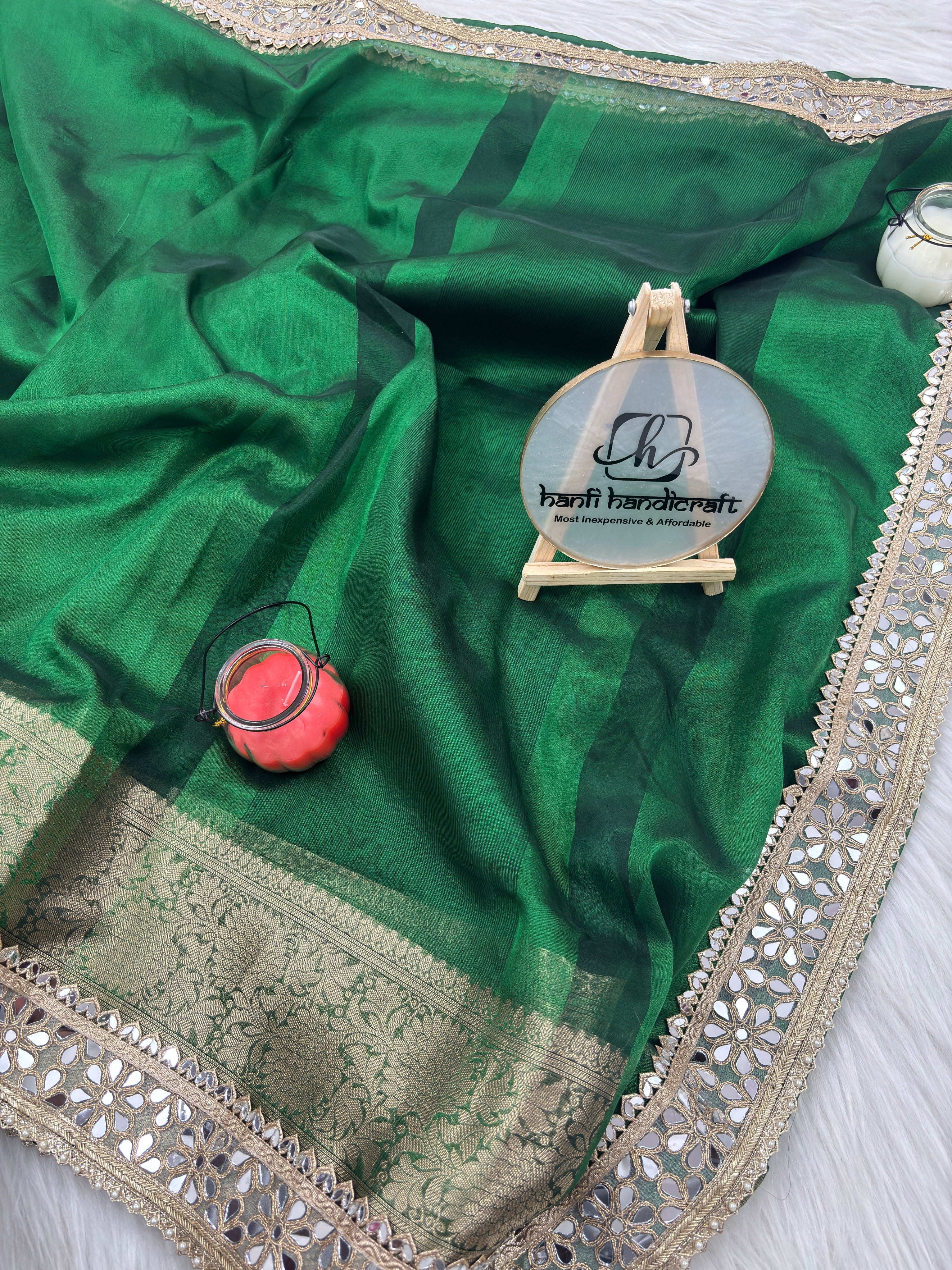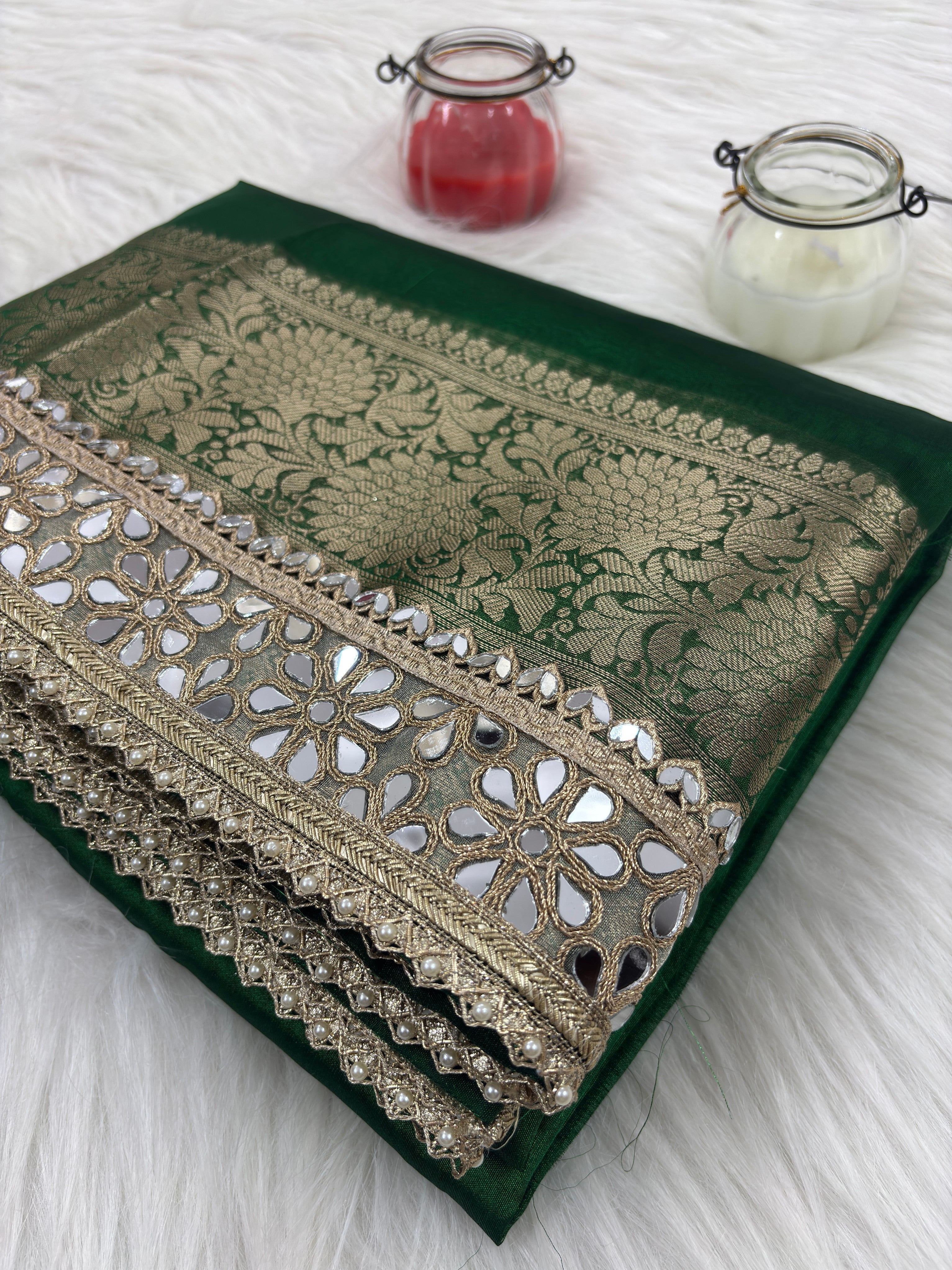 Bottle Green Banarasi Rajkumari Mirror Work Tissue Silk Saree