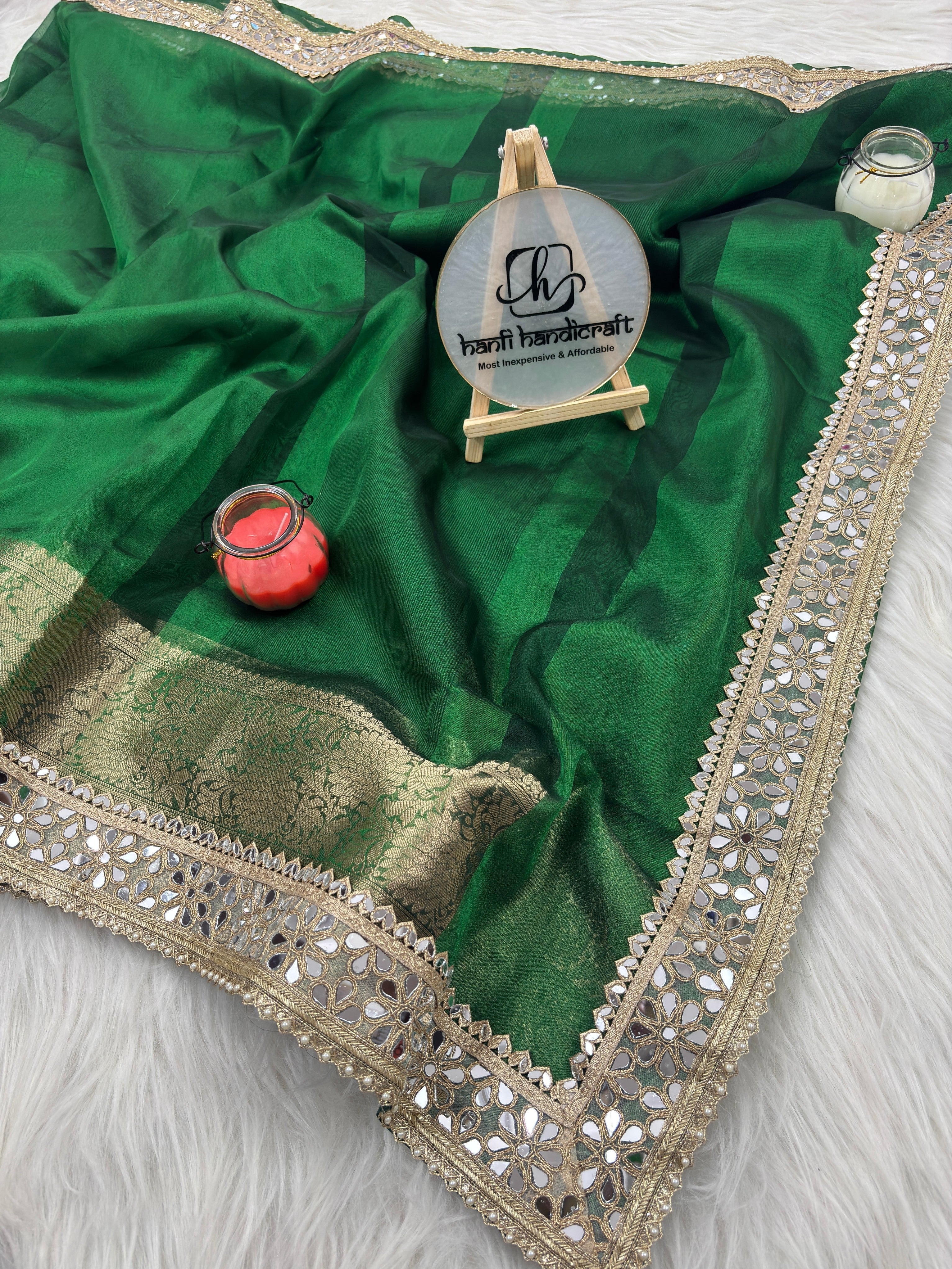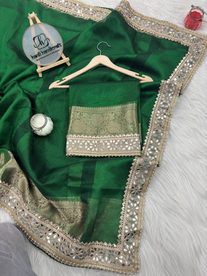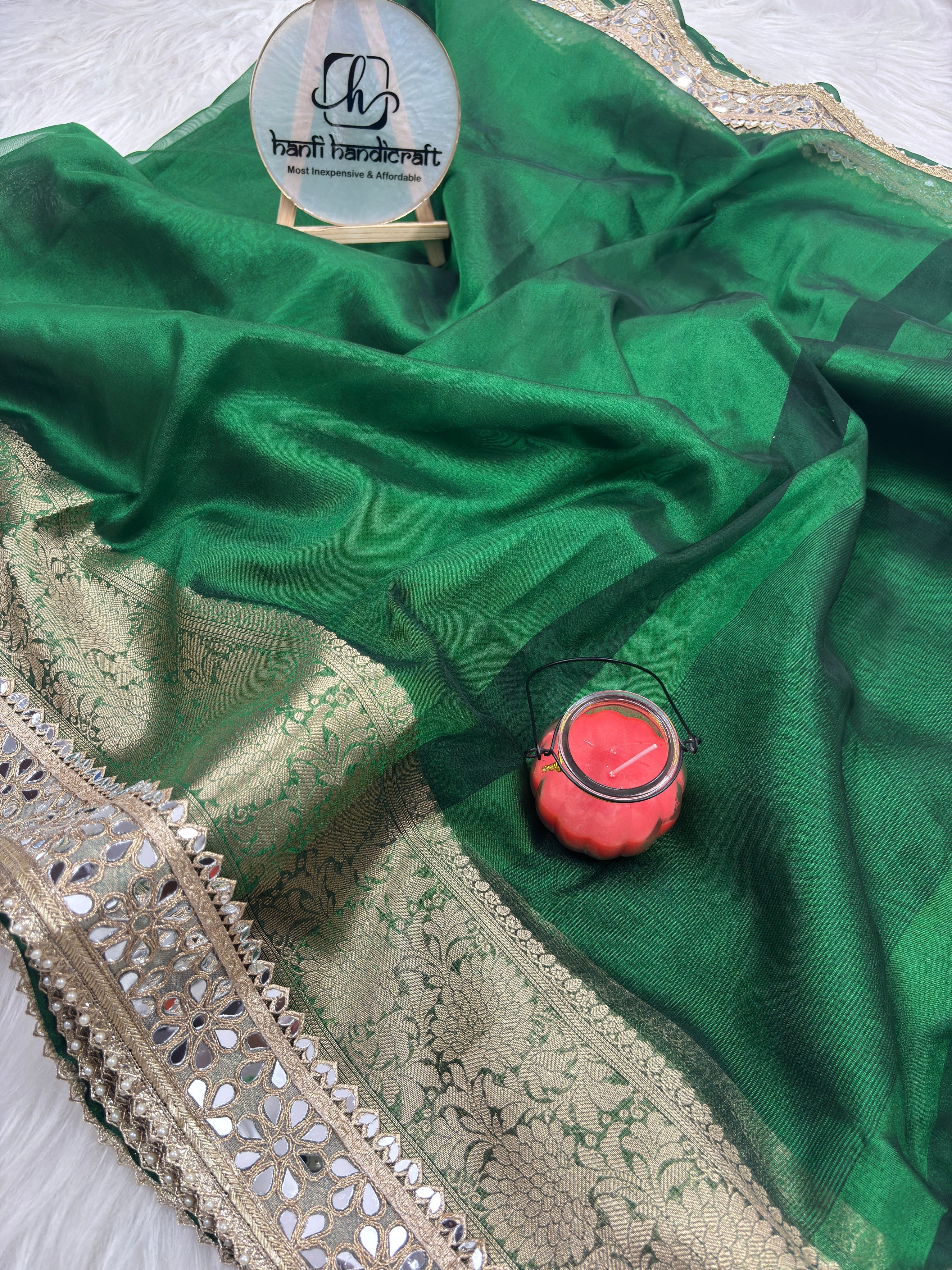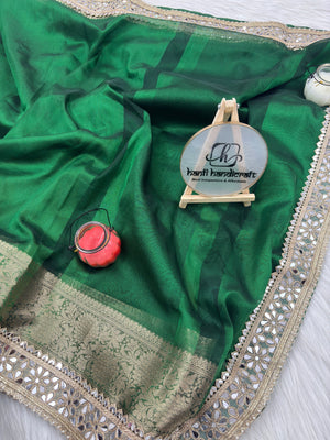 A Mirror-Kissed Classic drenched in the richness of bottle green tissue silk, this saree is hand-adorned with radiant mirror work along its border and pallu. Woven in Banaras by skilled artisans, it glows with quiet grandeur — a timeless drape that mirrors grace in every glance.