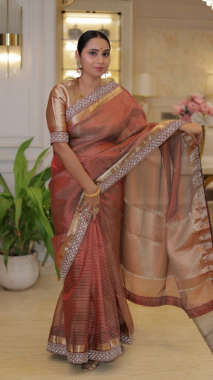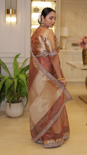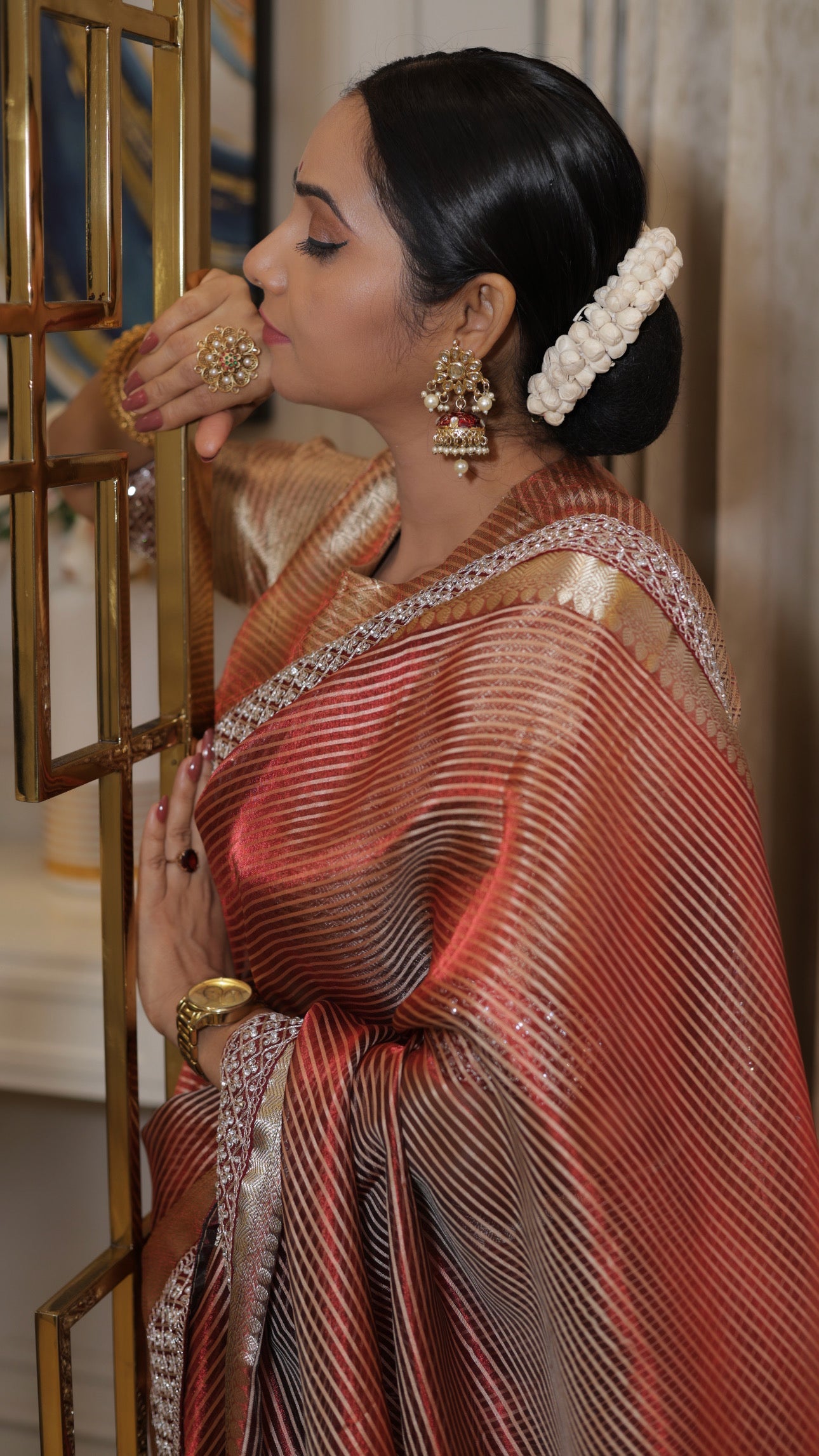 Celebrity-Inspired Wine Red Stripe Tissue Silk Saree with Stone Zardozi Work