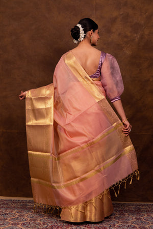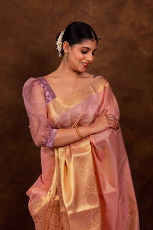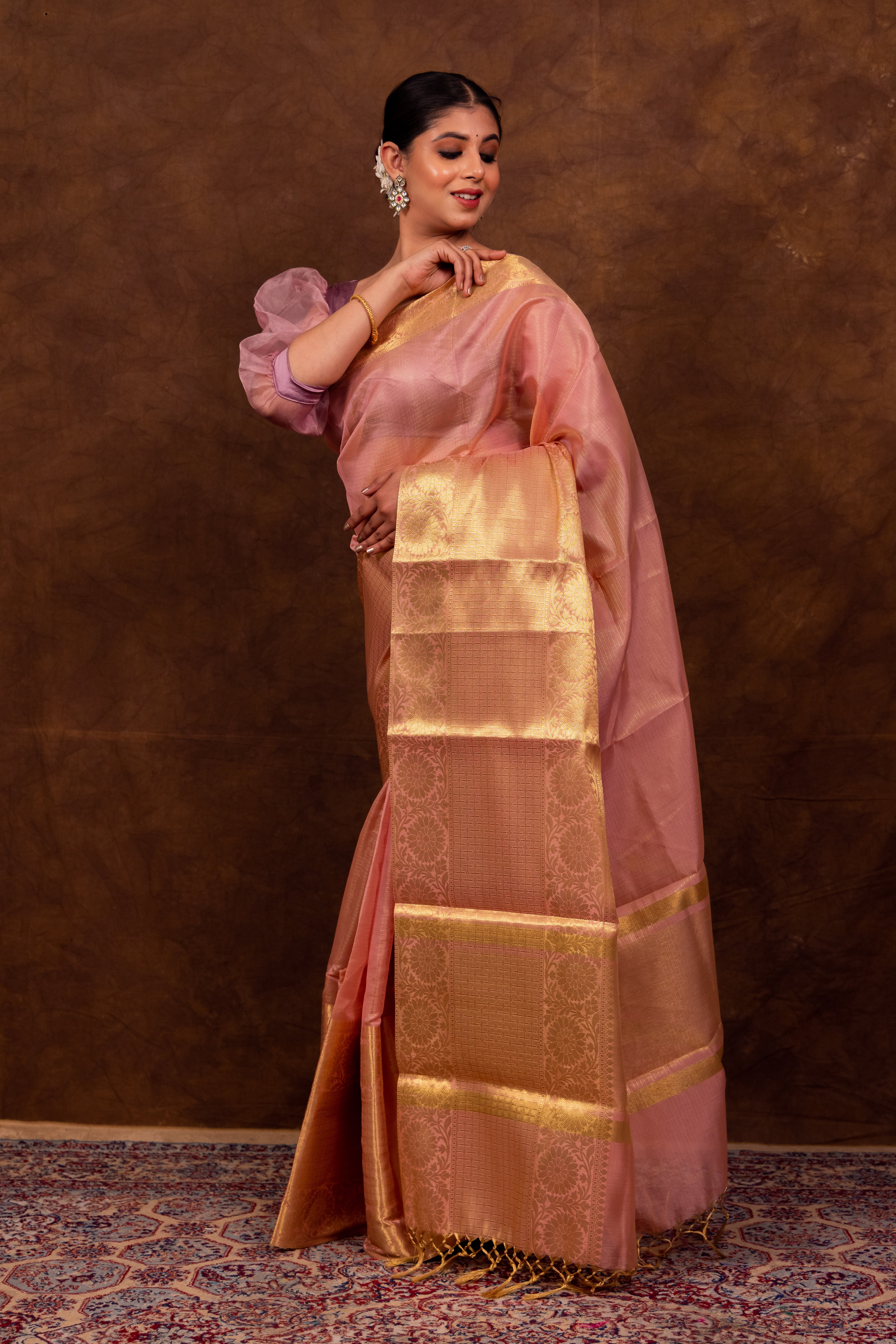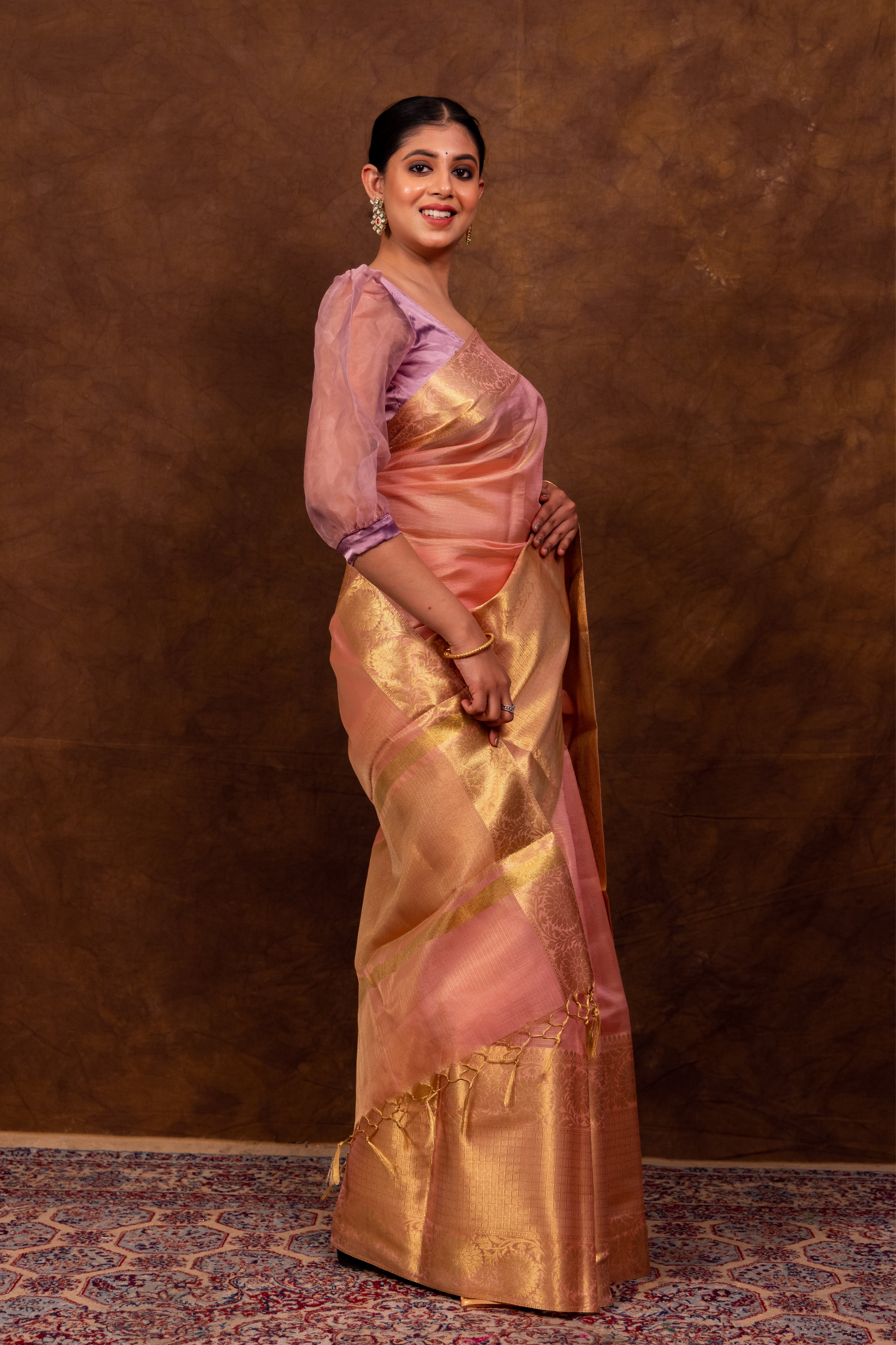 Coral Pink Banarasi Soft Tissue Silk Saree | Easy To Drape & Pleat