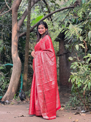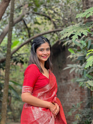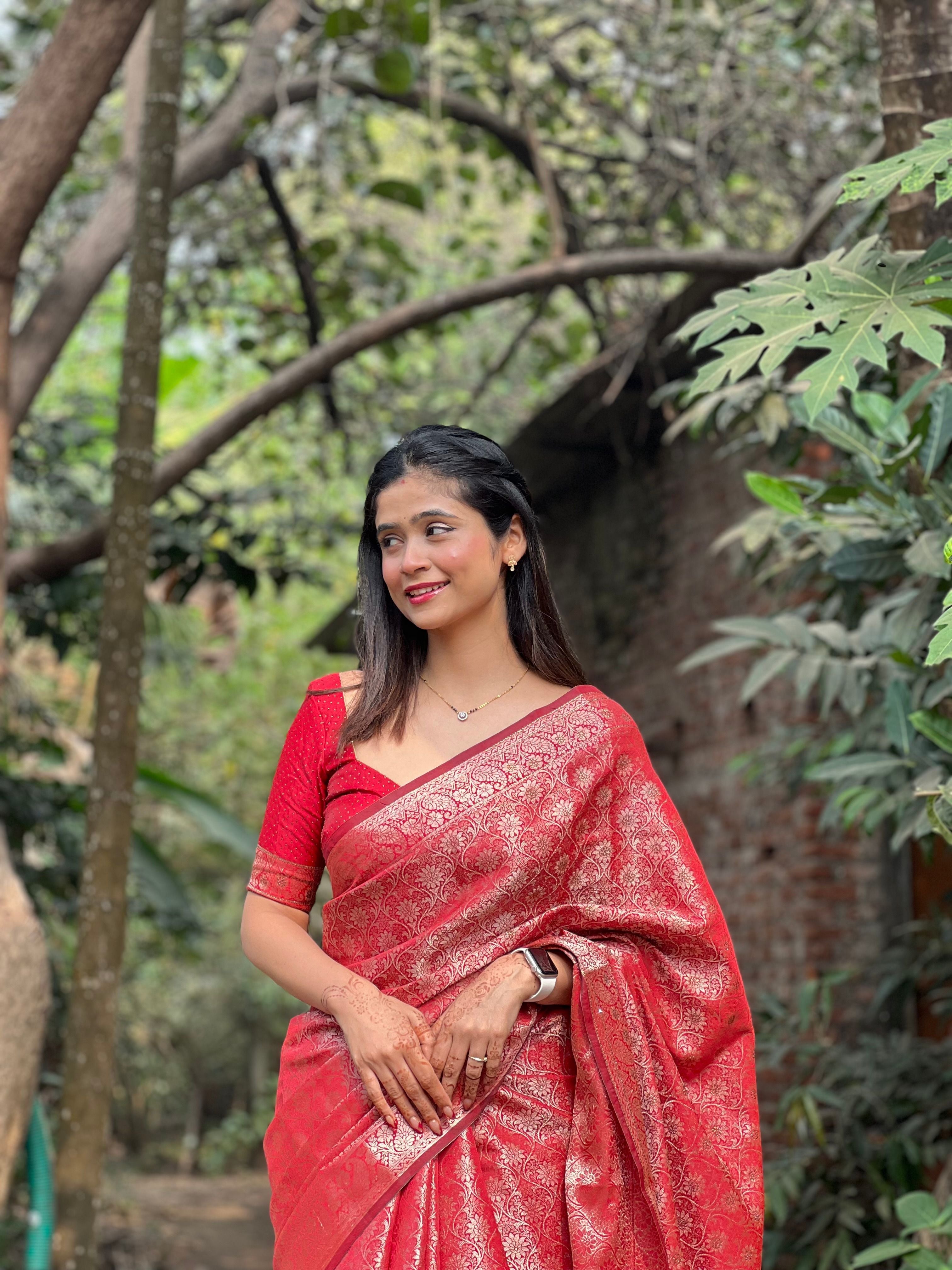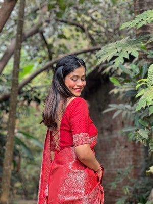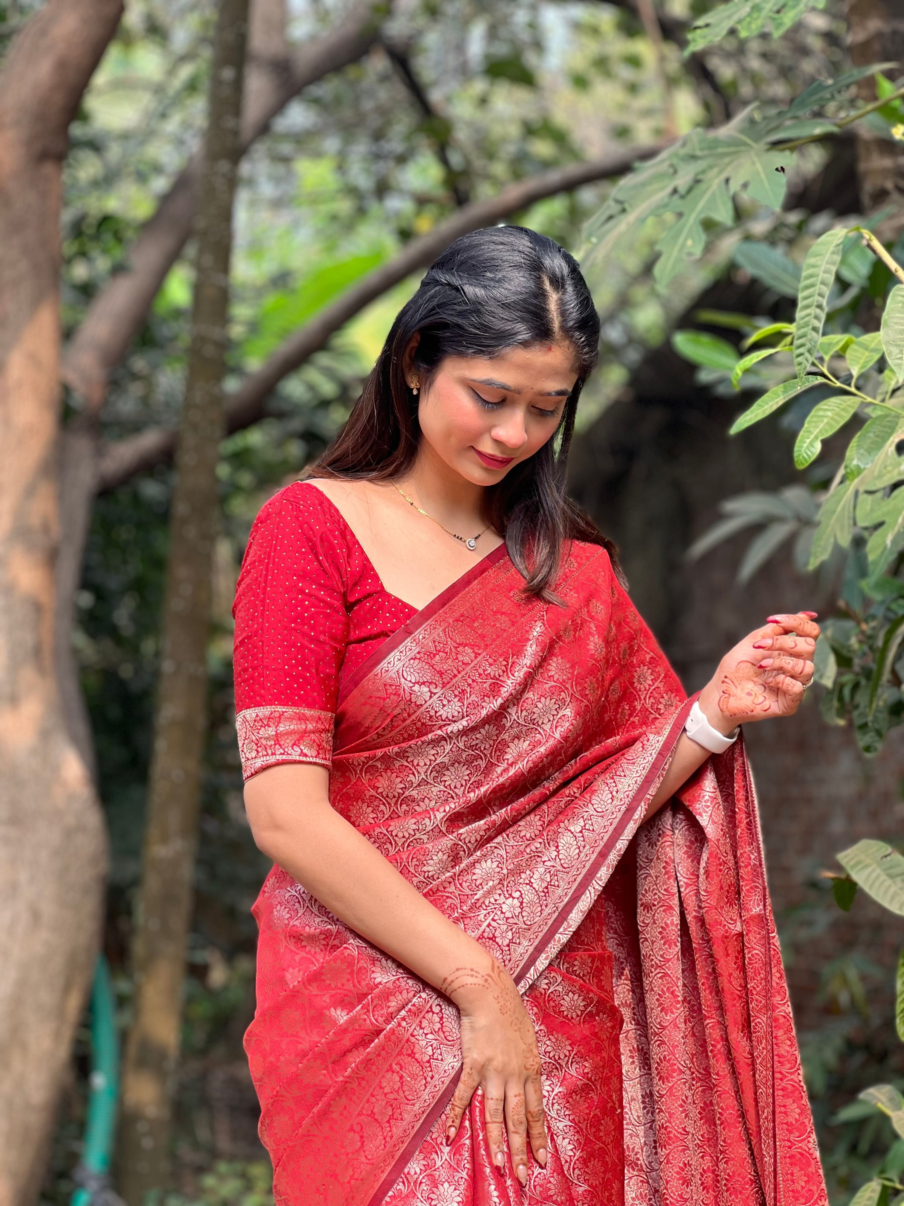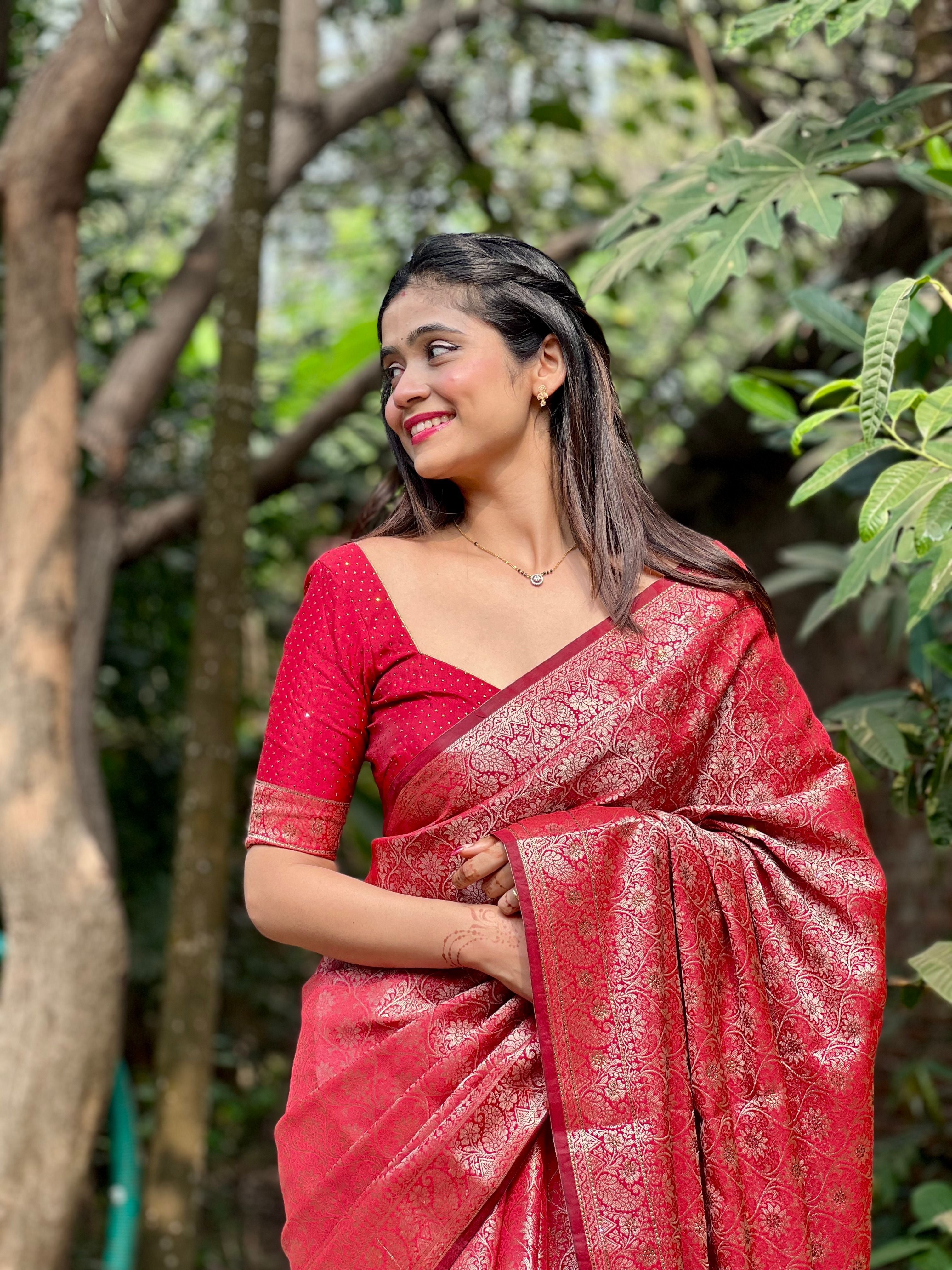 Crimson Red Banarasi Soft Silk Saree with Siroski Stone Work Embroidered Blouse & Saree
