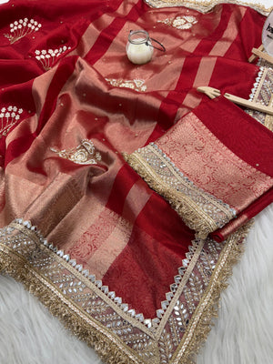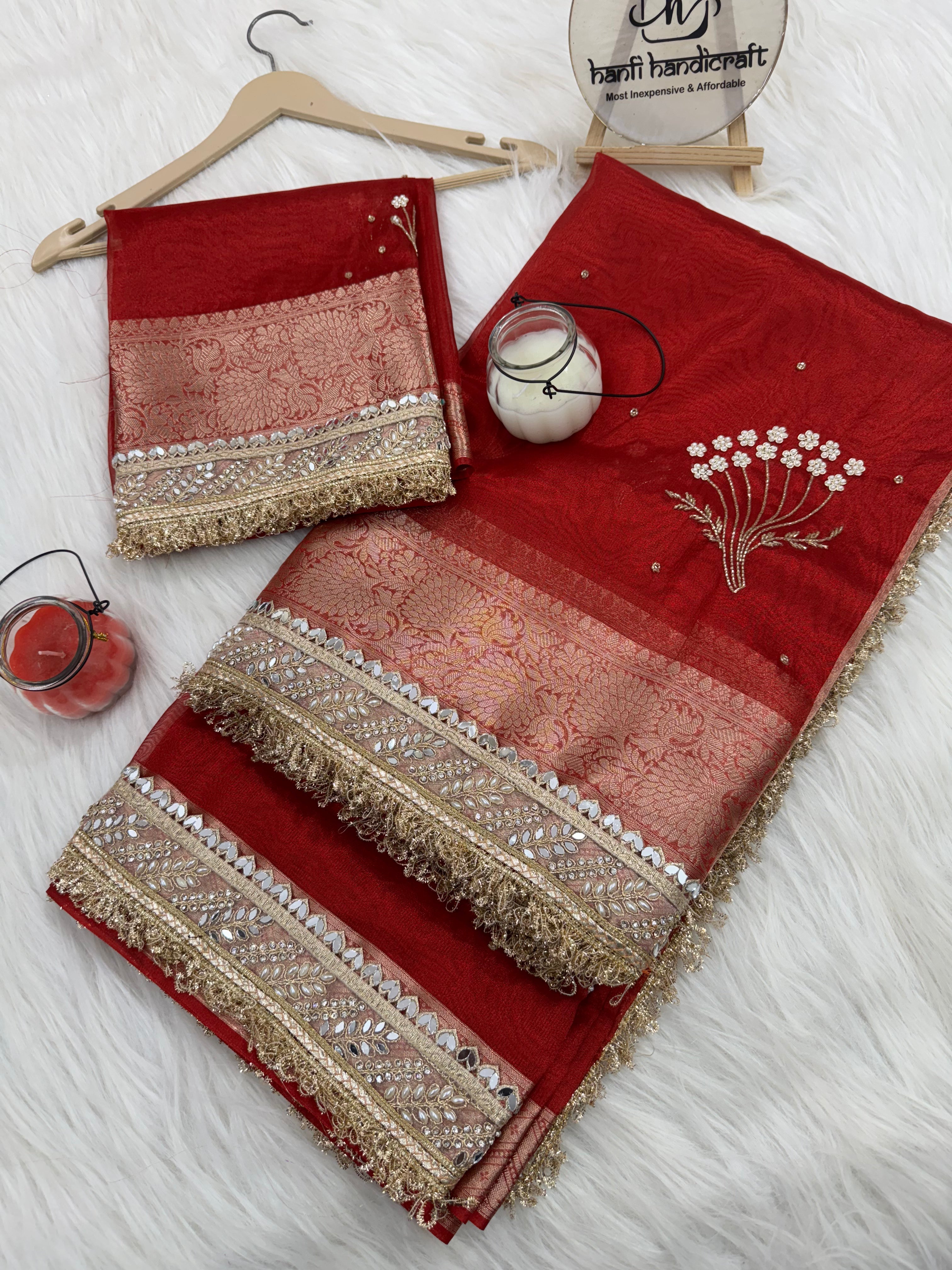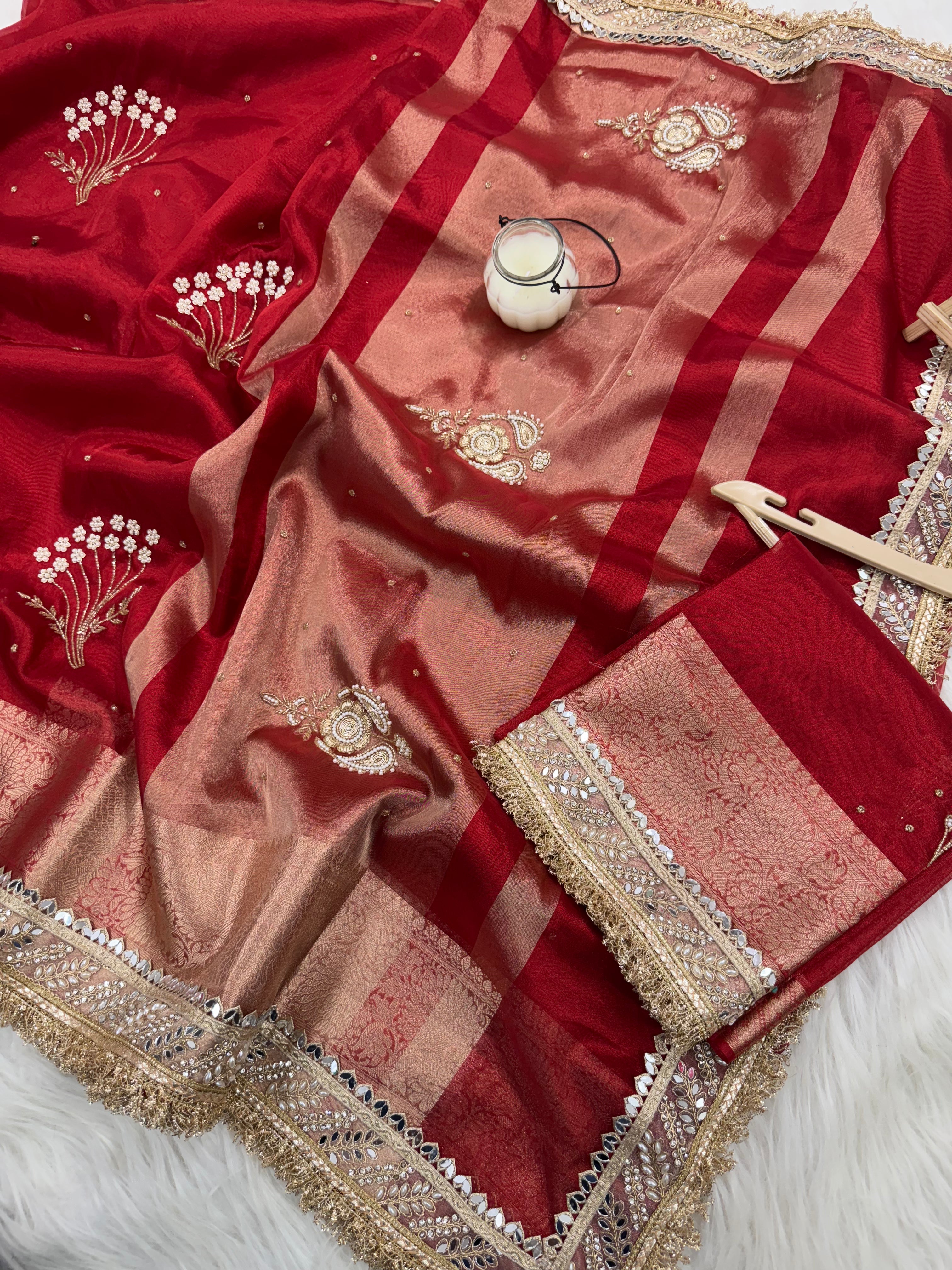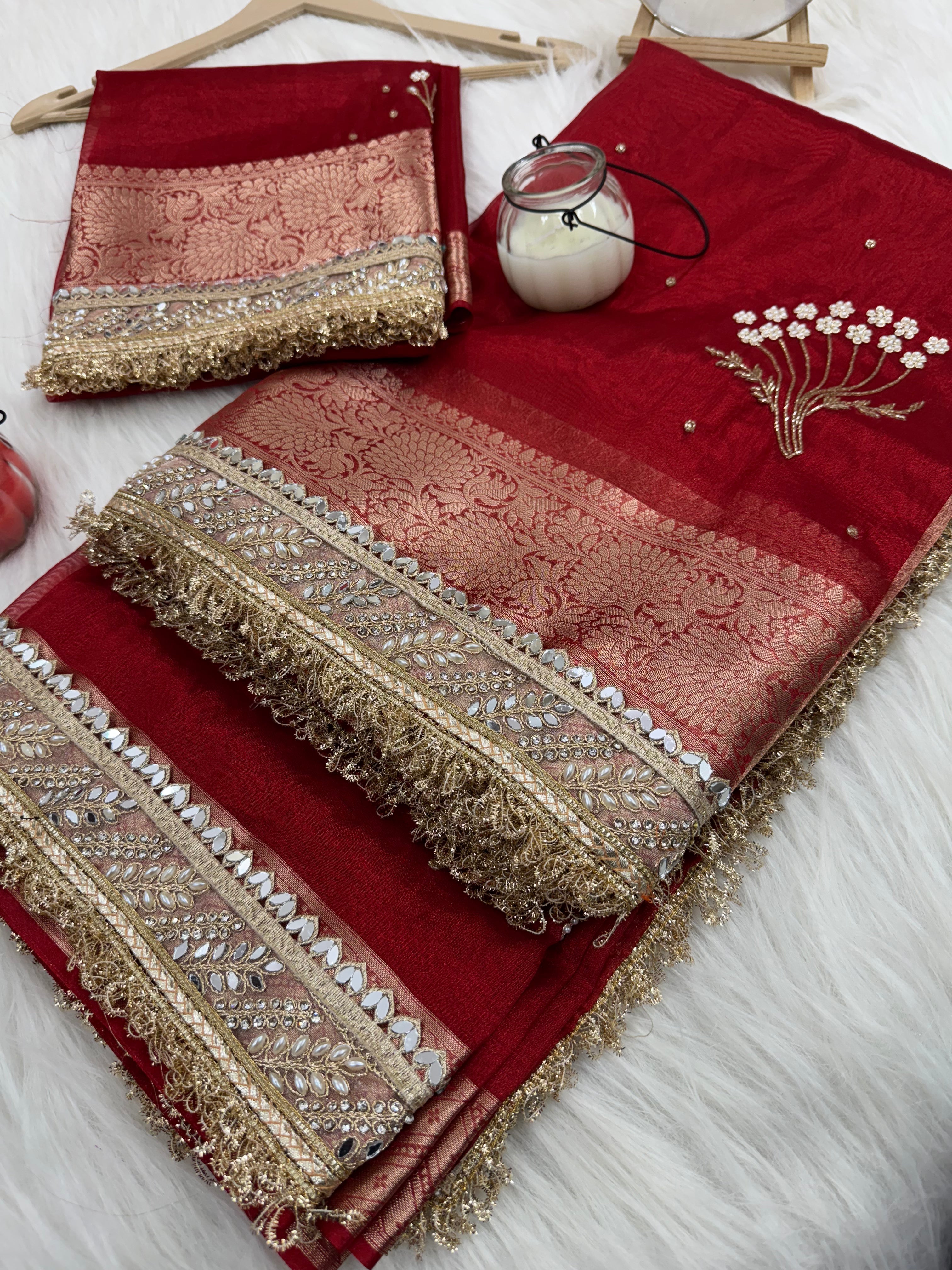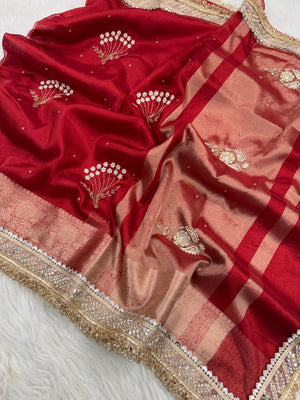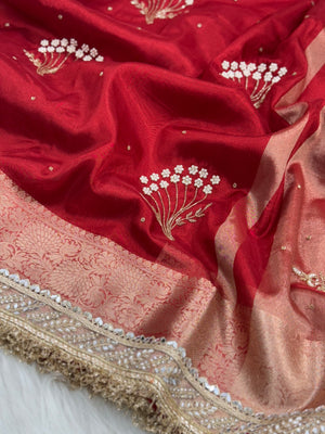 Deep red tissue silk saree with intricate pearl motifs, mirror borders, and hand zardozi detailing. A masterpiece of Banarasi craftsmanship, perfect for weddings, festive occasions, and evening soirees.