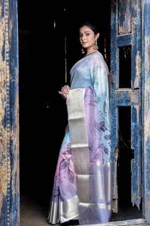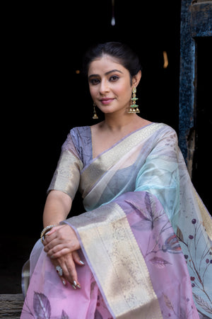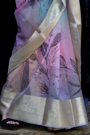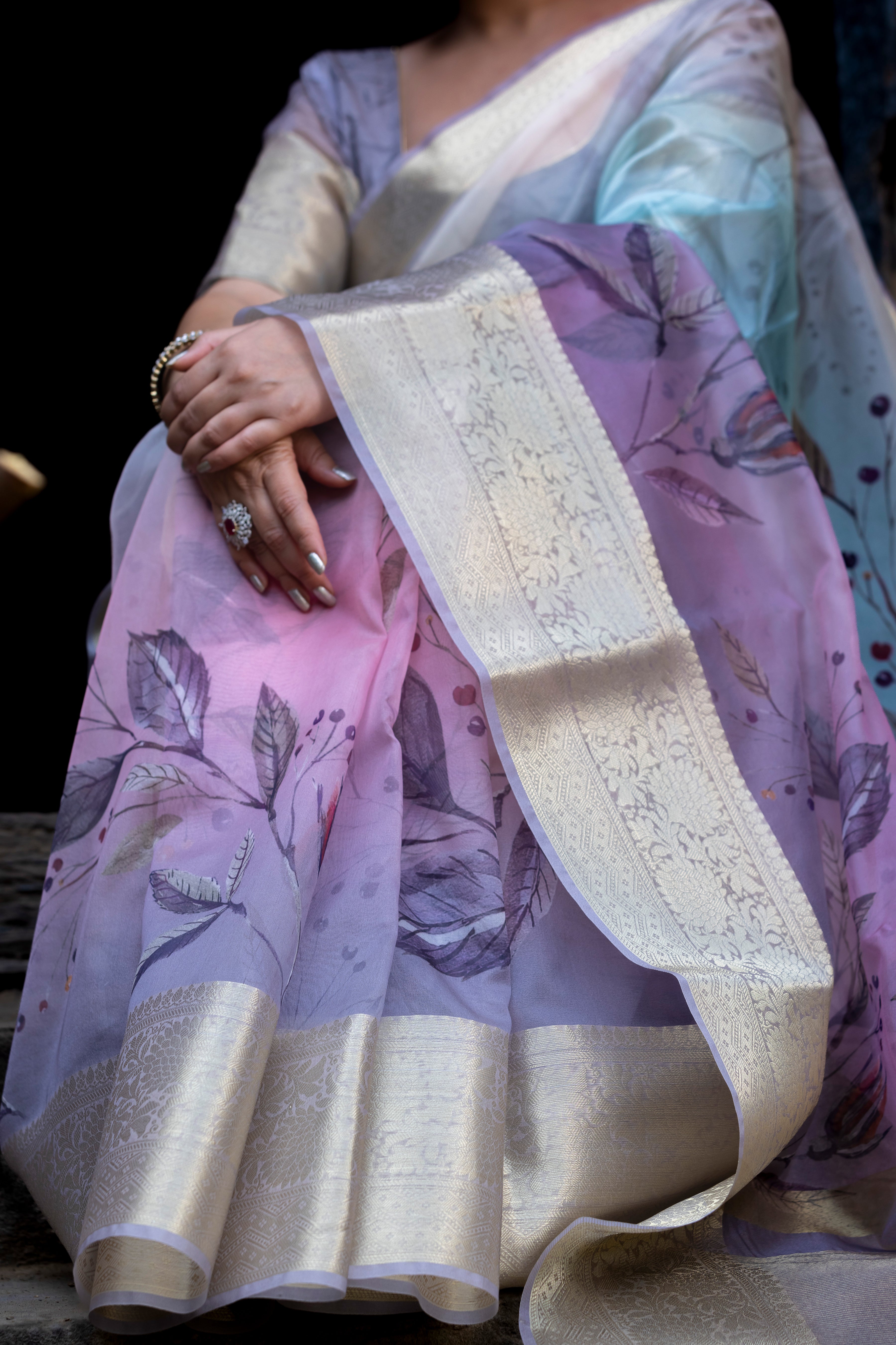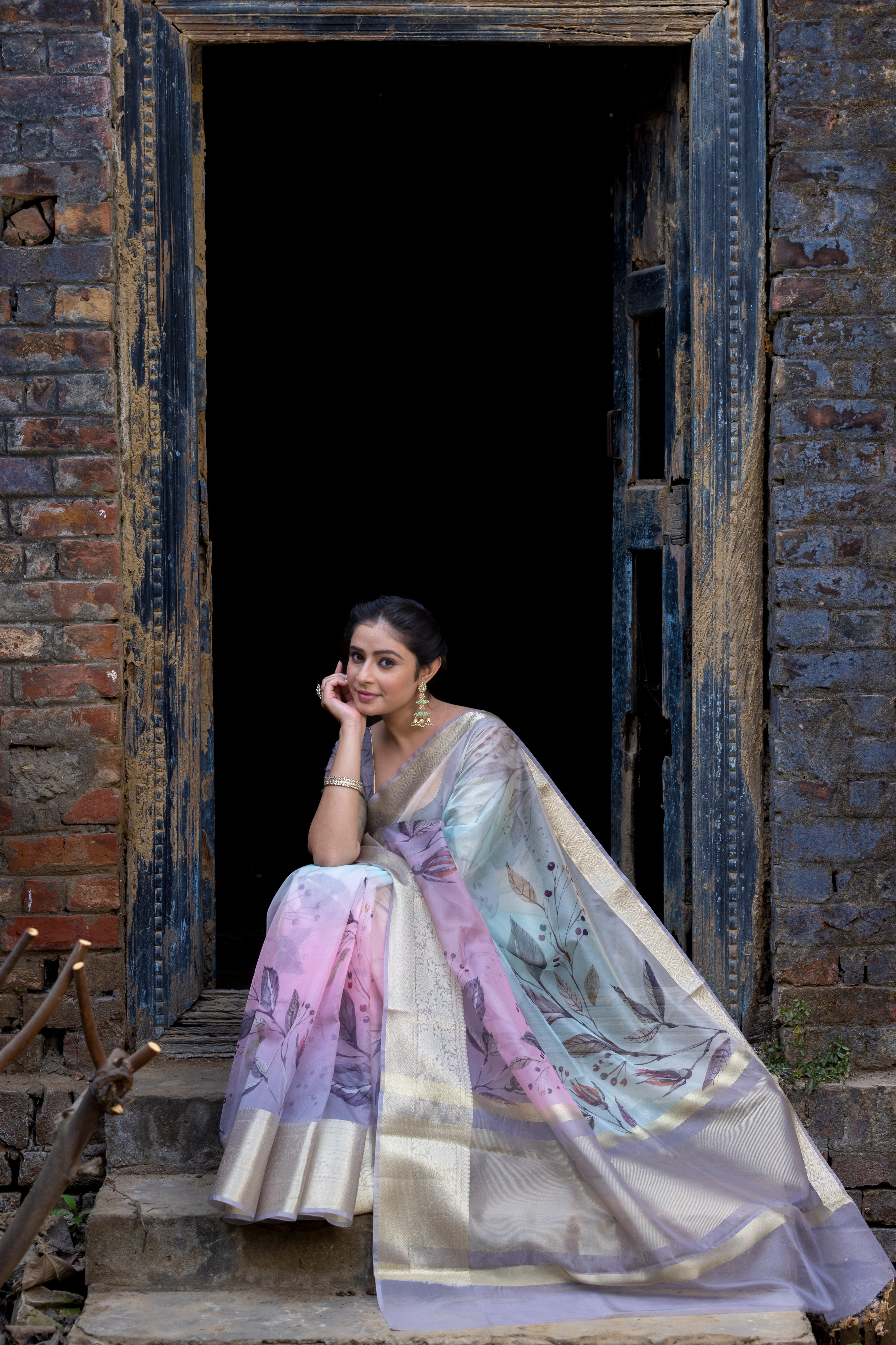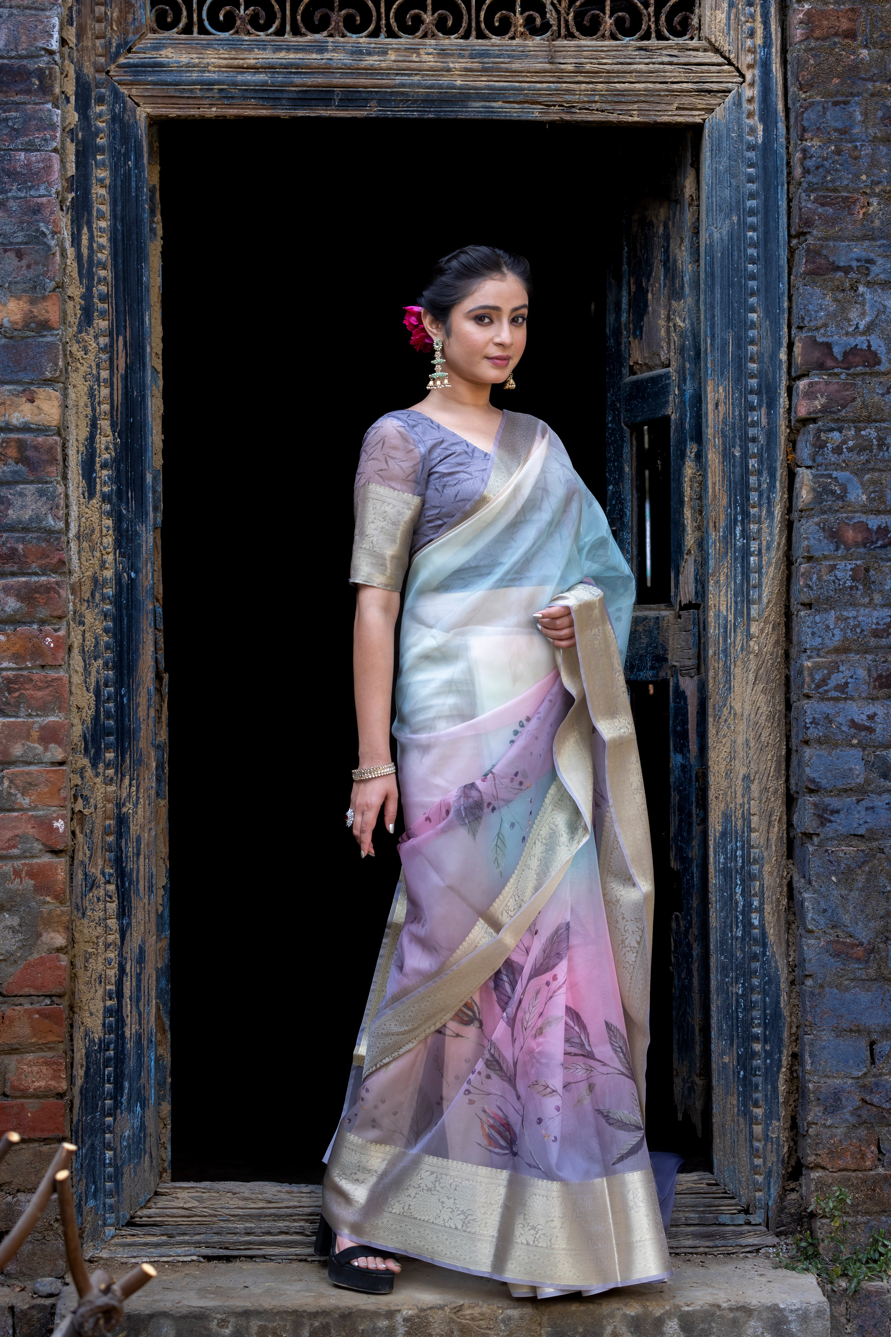 Embrace ethnic modernization with our stylish organza silk sarees, featuring golden zari borders and vibrant digital prints. Perfect for any occasion, elevate your wardrobe today