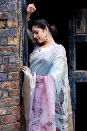 Earthy Neon Organza Silk Saree with Banarasi Zari Border | Full Leaf Pattern