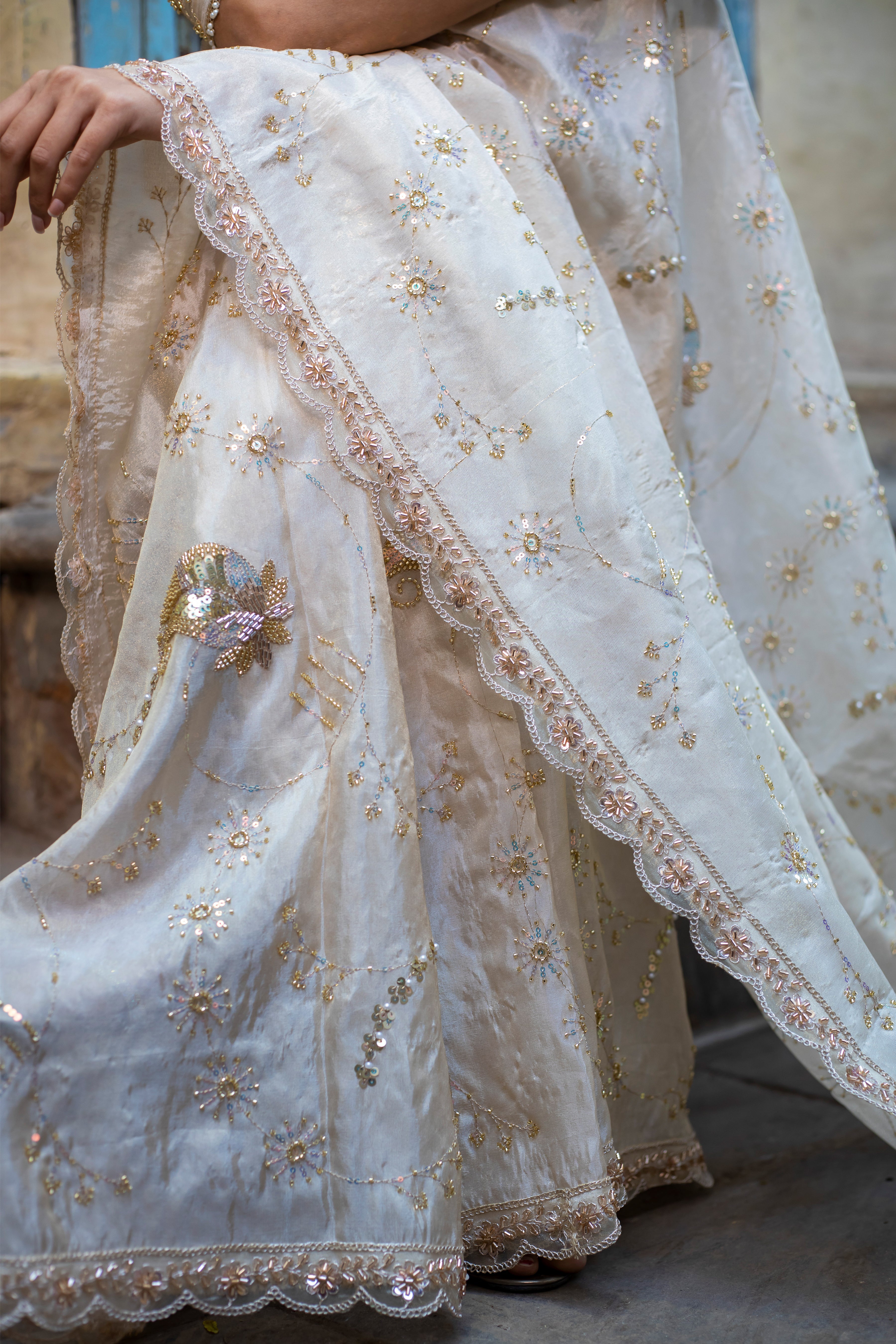 💫 Unique Katdana work body and laces adorn borders & pallu, blending Bollywood glamour with India’s top designer inspirations.