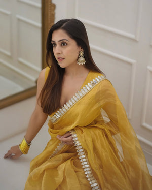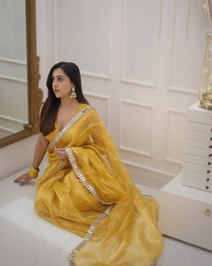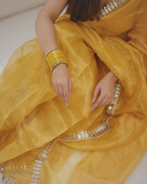 Golden Grace Sunstone Mirror Work Designer Tissue Silk Saree