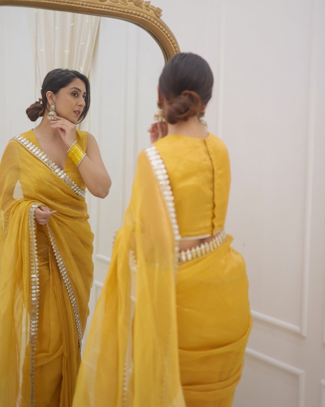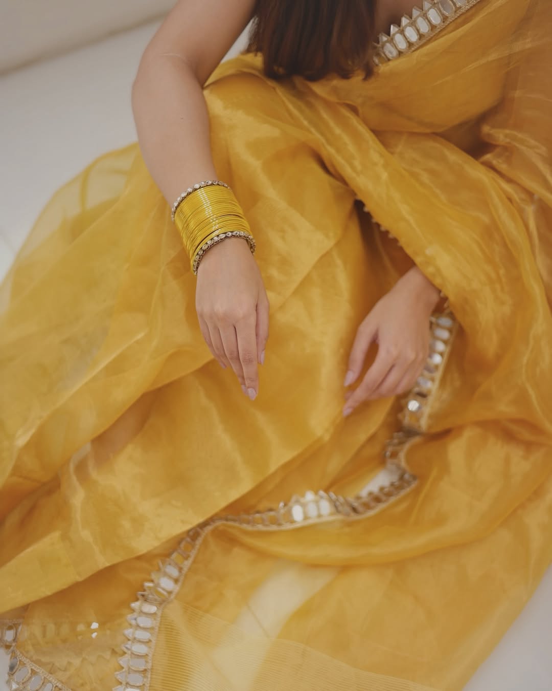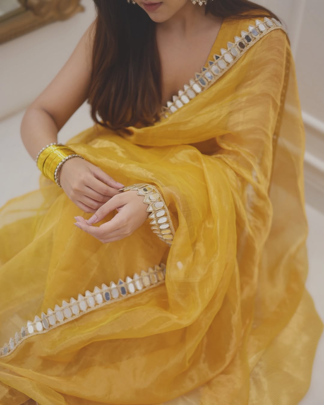 Draped in the golden grace soft shimmer of tissue silk, glows with hand mirror work on the border and pallu. Crafted by the skilled artisans of Banaras, this saree captures sunlight in every thread — an ode to elegance, radiance, and timeless artistry.