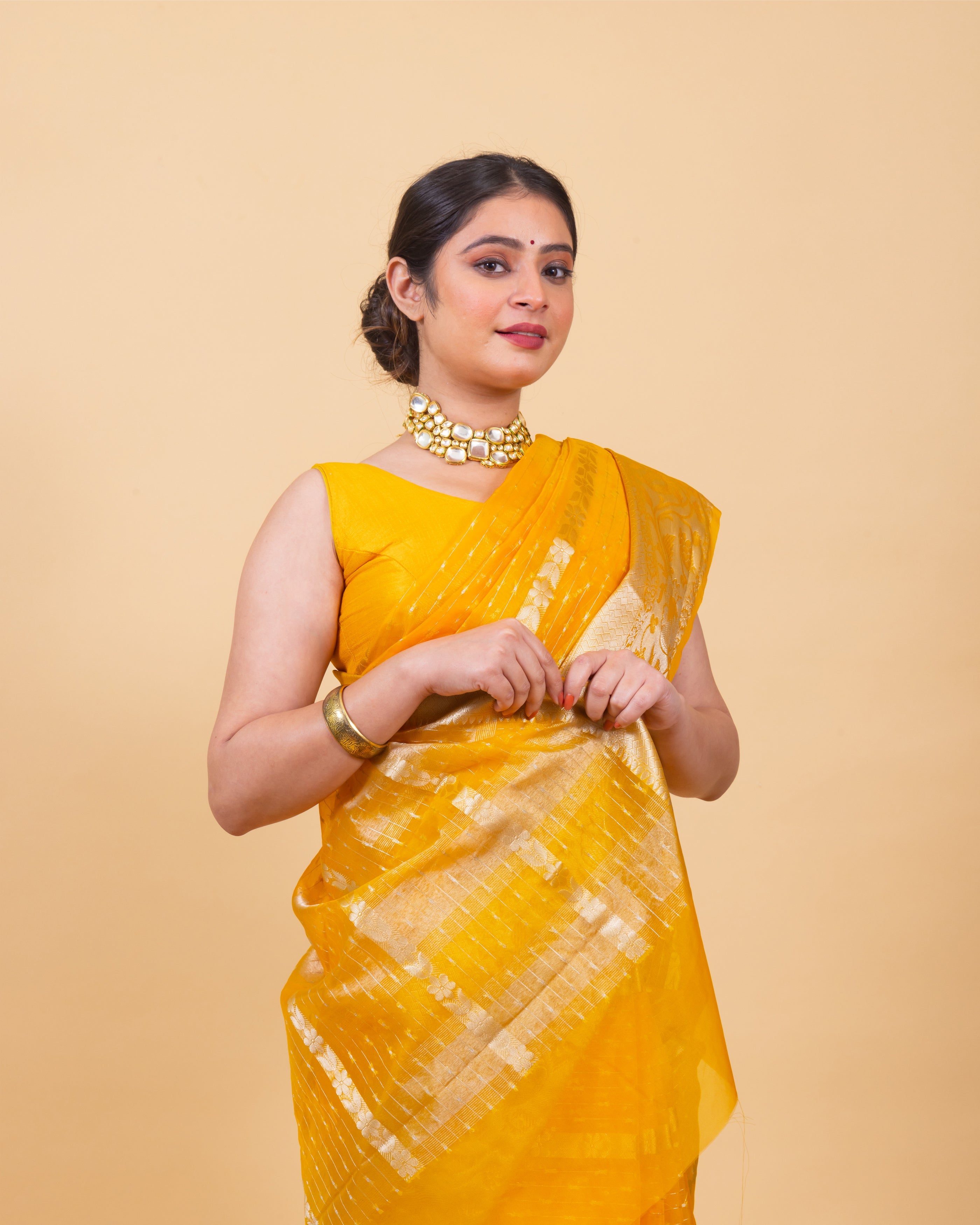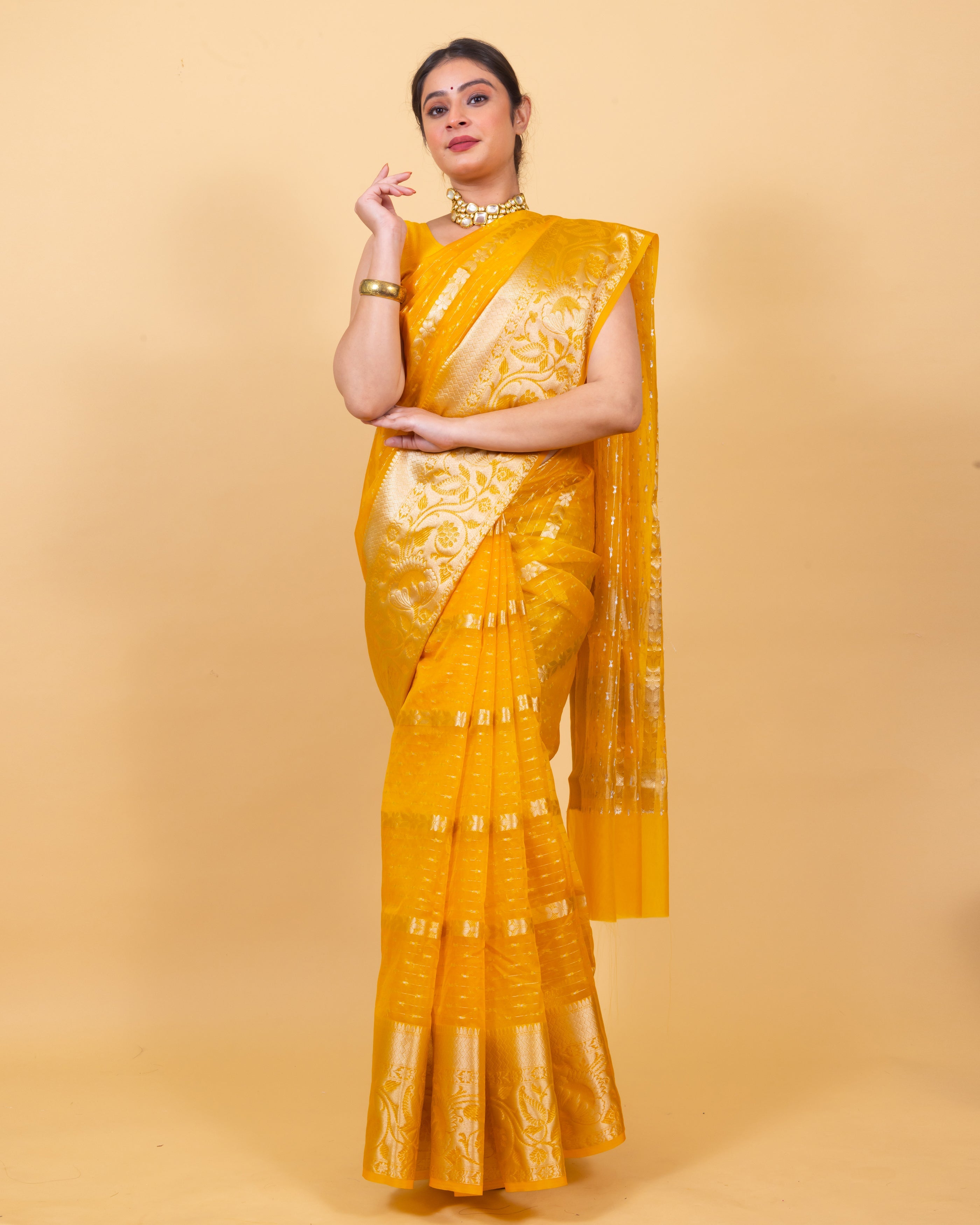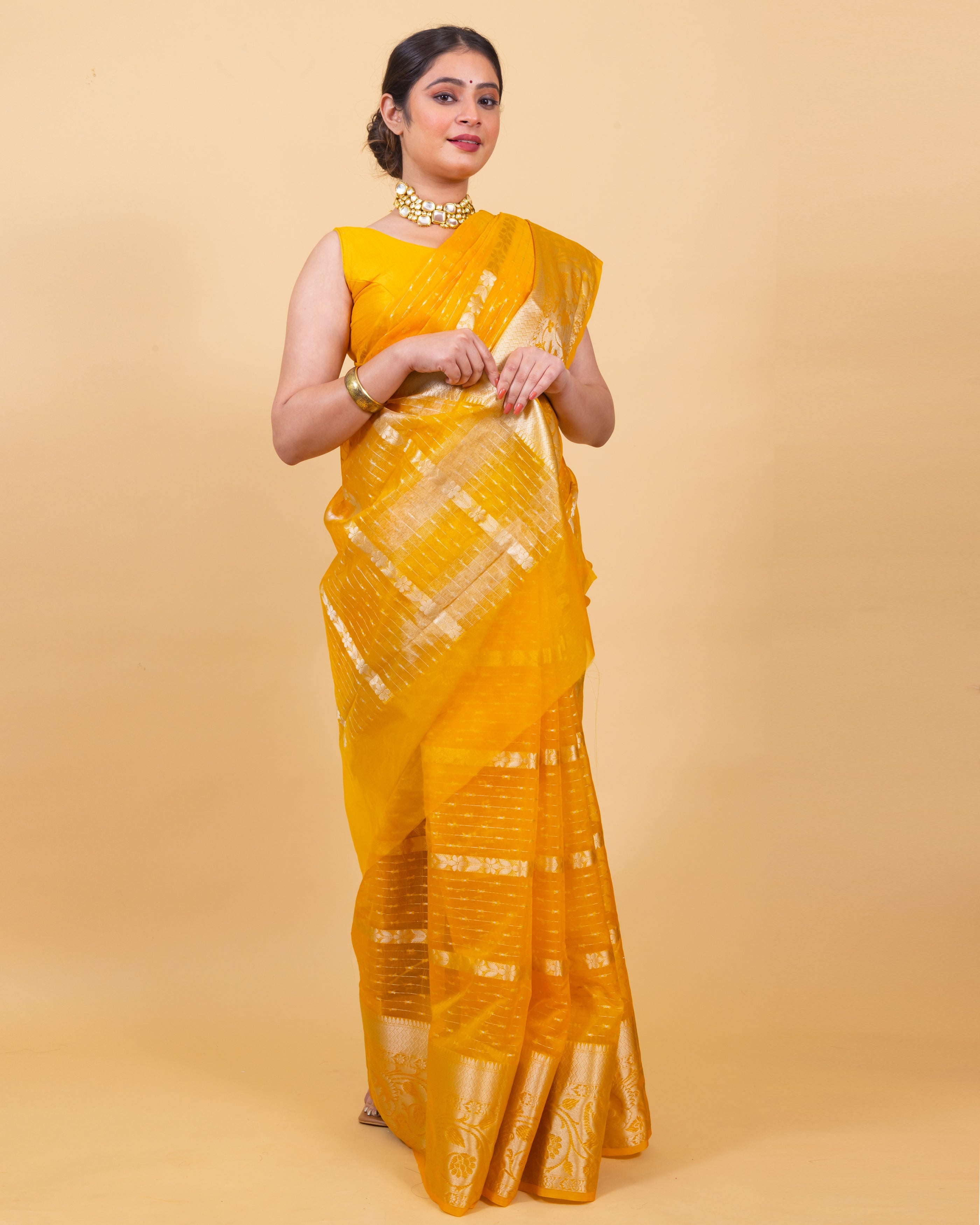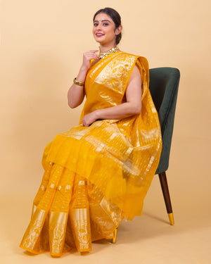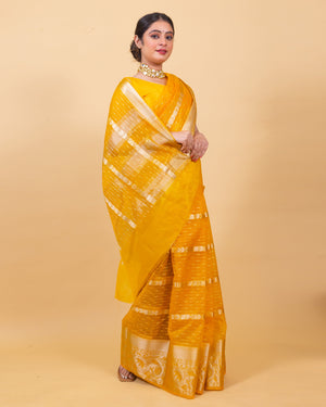 Golden Yellow Banarasi Organza Stripe Pattern Saree | Soft & Elegant