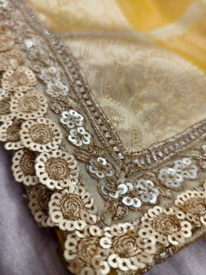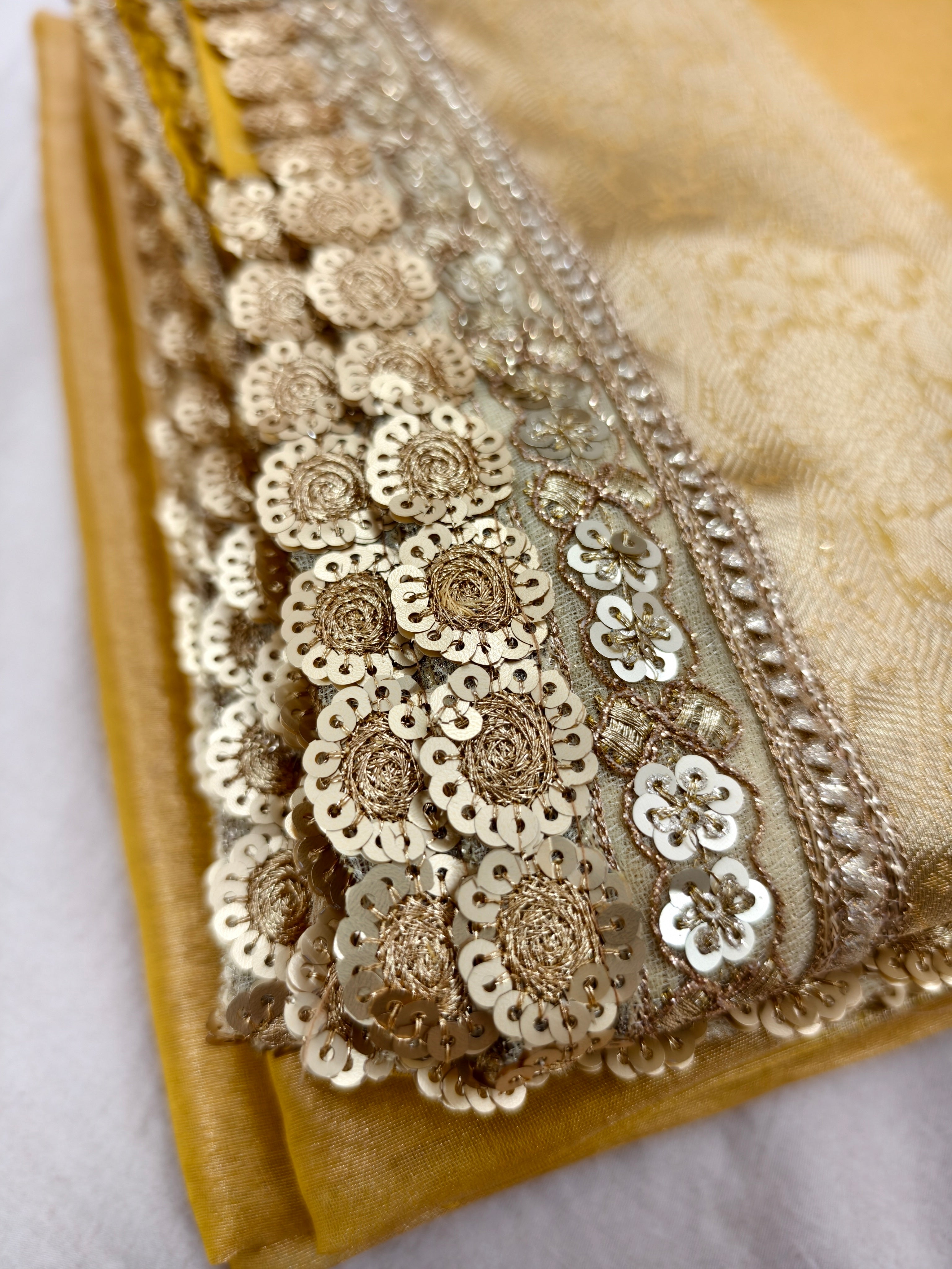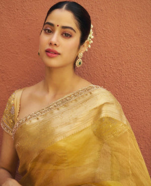 Janhvi Kapoor Inspired Gold Zari Soft Tissue Silk Saree with Handmade Cutwork Laces