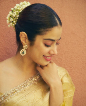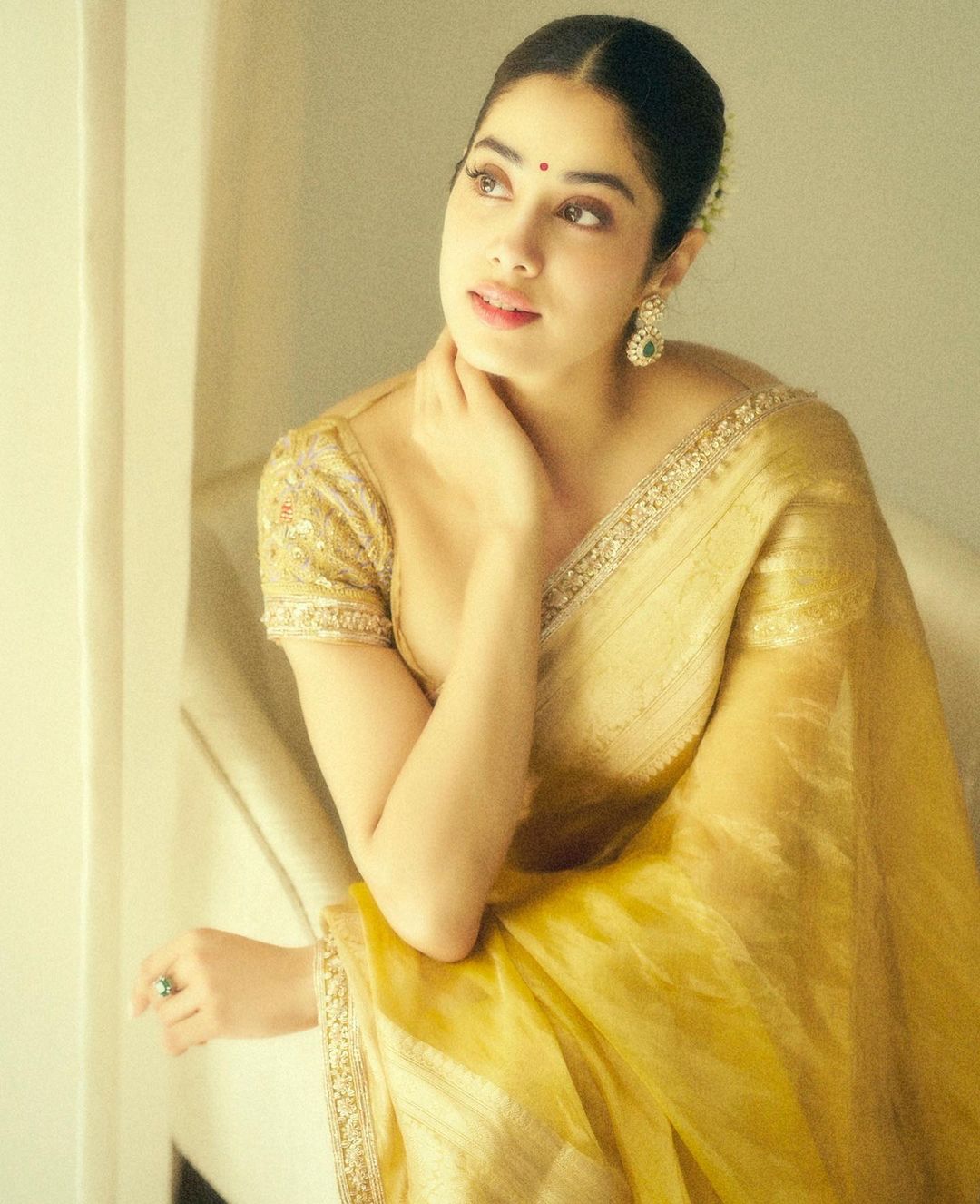 Get Janhvi kapoor shimmering look with our premium gold zari soft tissue silk saree with handmade cutwork laces on the borders, available for any celebration, wedding, or occasion ❤️ 🥻