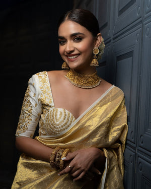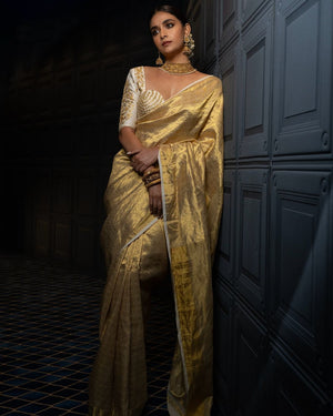 Exclusive Keerthy Suresh Inspired tissue silk brocade zari silk saree gives you a royal appearance & makes you shine with luxury. This vintage tissue silk saree is made up of fine banarasi soft zari threads fabric, emphasizes luxury, and represents both quality and style.
