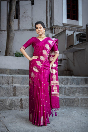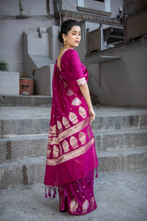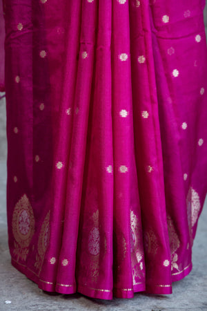 This Magenta Pink banarasi saree is a masterpiece of artistry, adorned with intricate motif designs inspired by nature and mughal architecture. Delicate florals, paisleys, and boota patterns are woven with gold or silver zari, creating a luxurious tapestry. Each motif tells a story, reflecting timeless elegance and the rich heritage of Varanasi's weaving tradition."