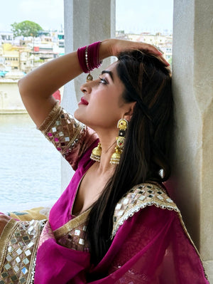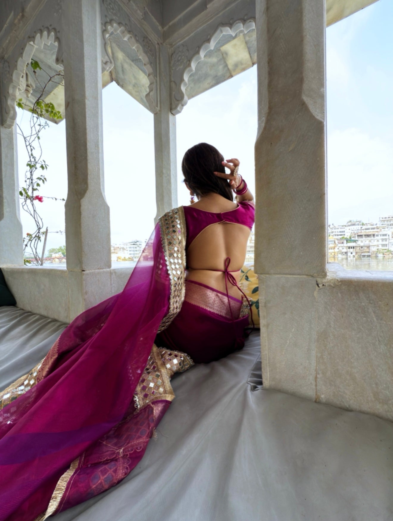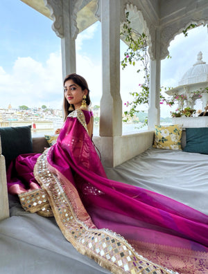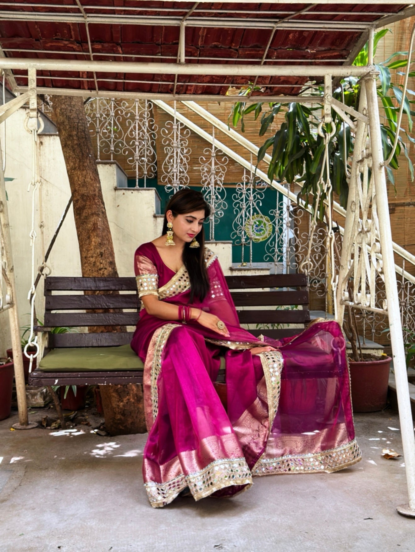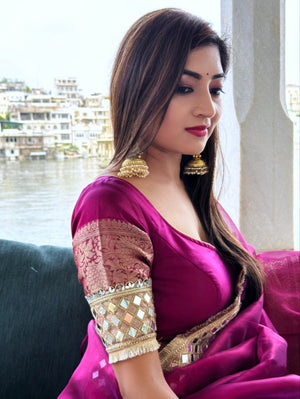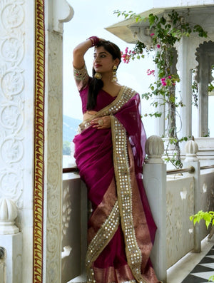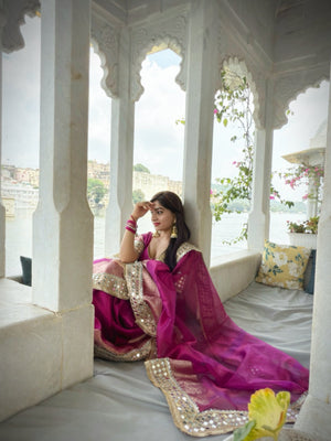 Magenta Pink Banarasi Rajwada Mirror Work Tissue Silk Saree