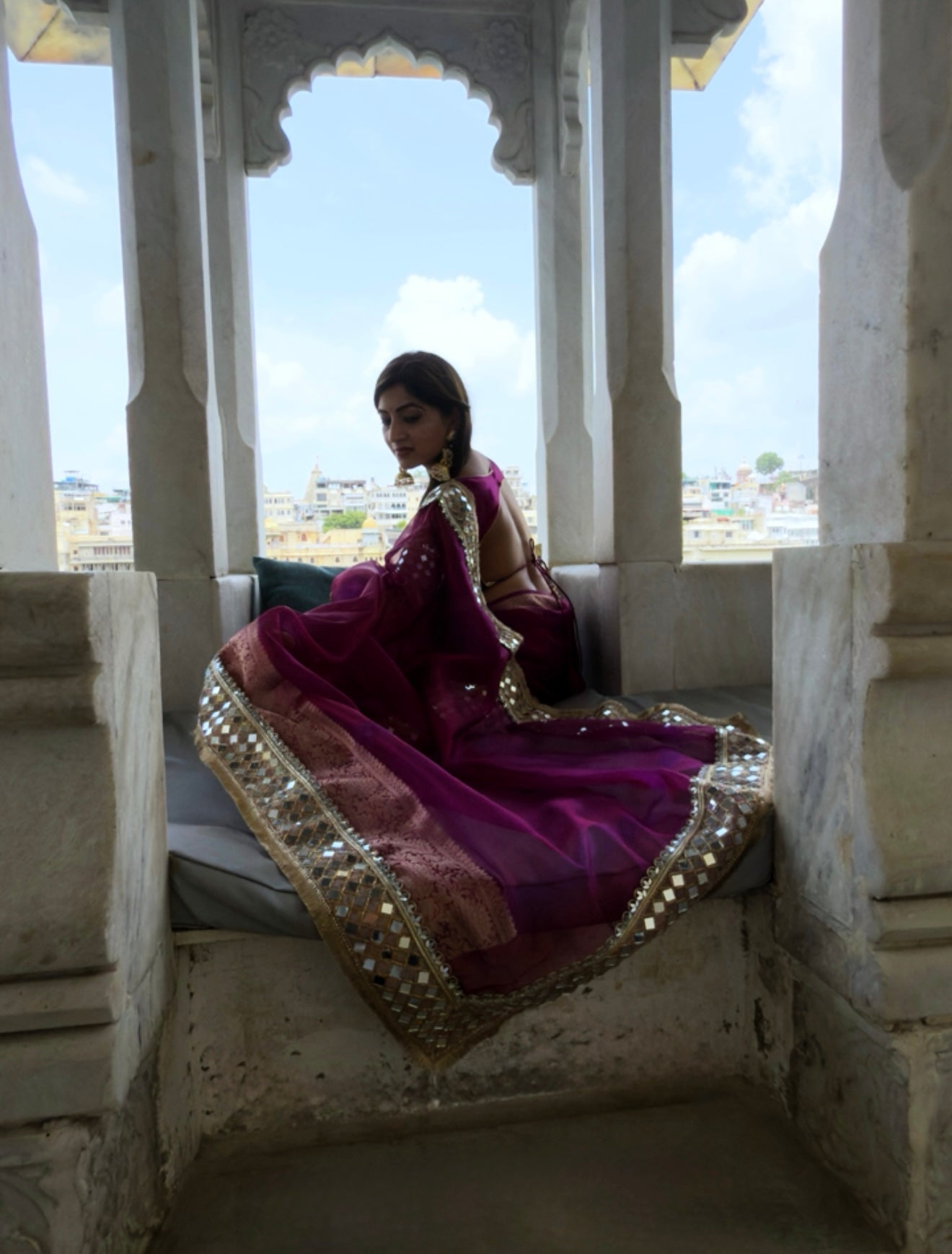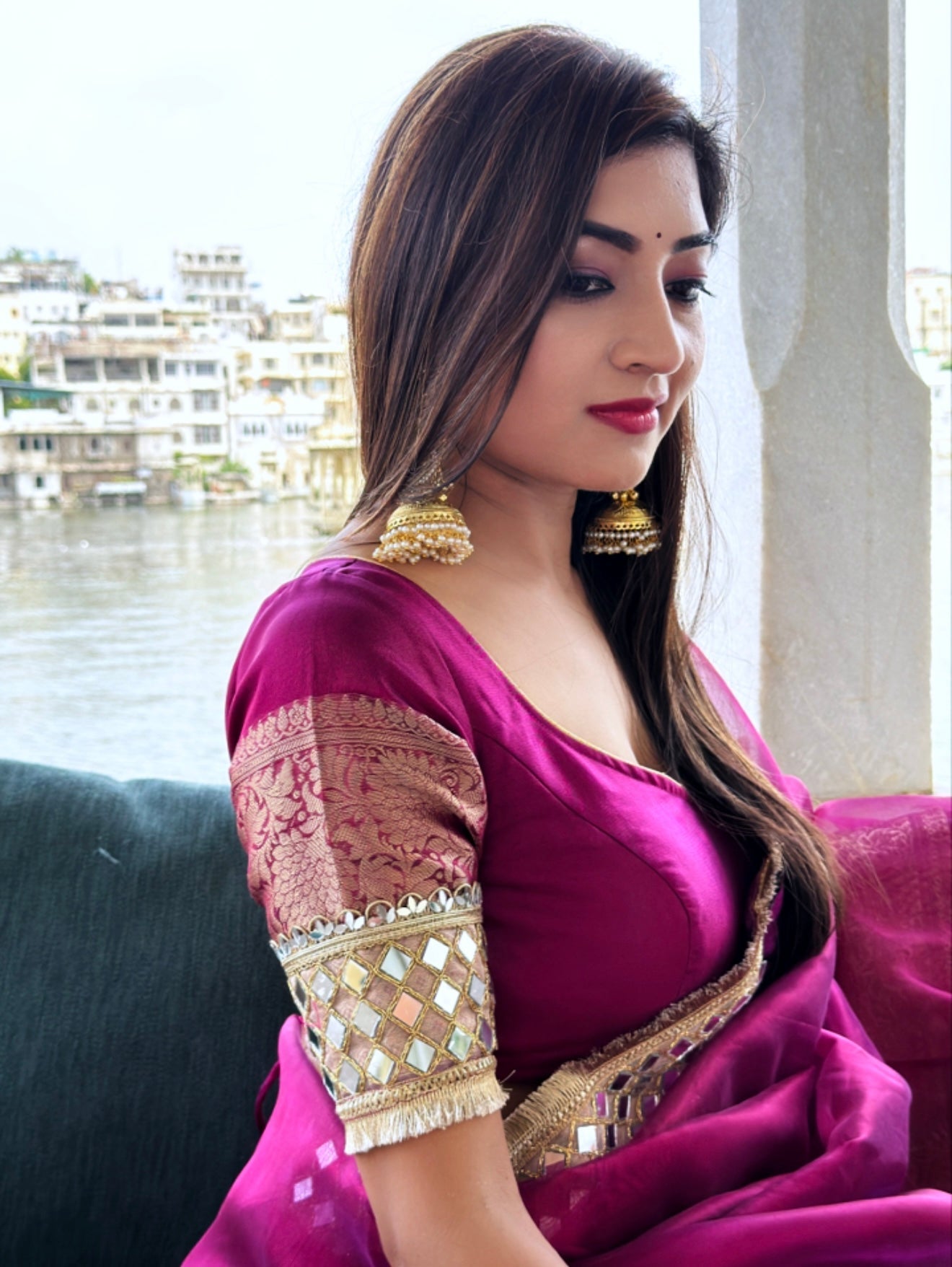 Inspired from the fearless queen which reflects courage and dominant spirit, the banarasi pattern with modern designer mirror makes this saree unique and elegant 🌼