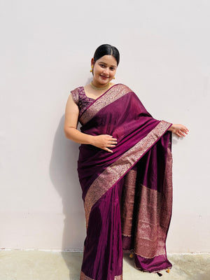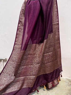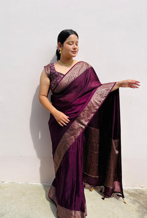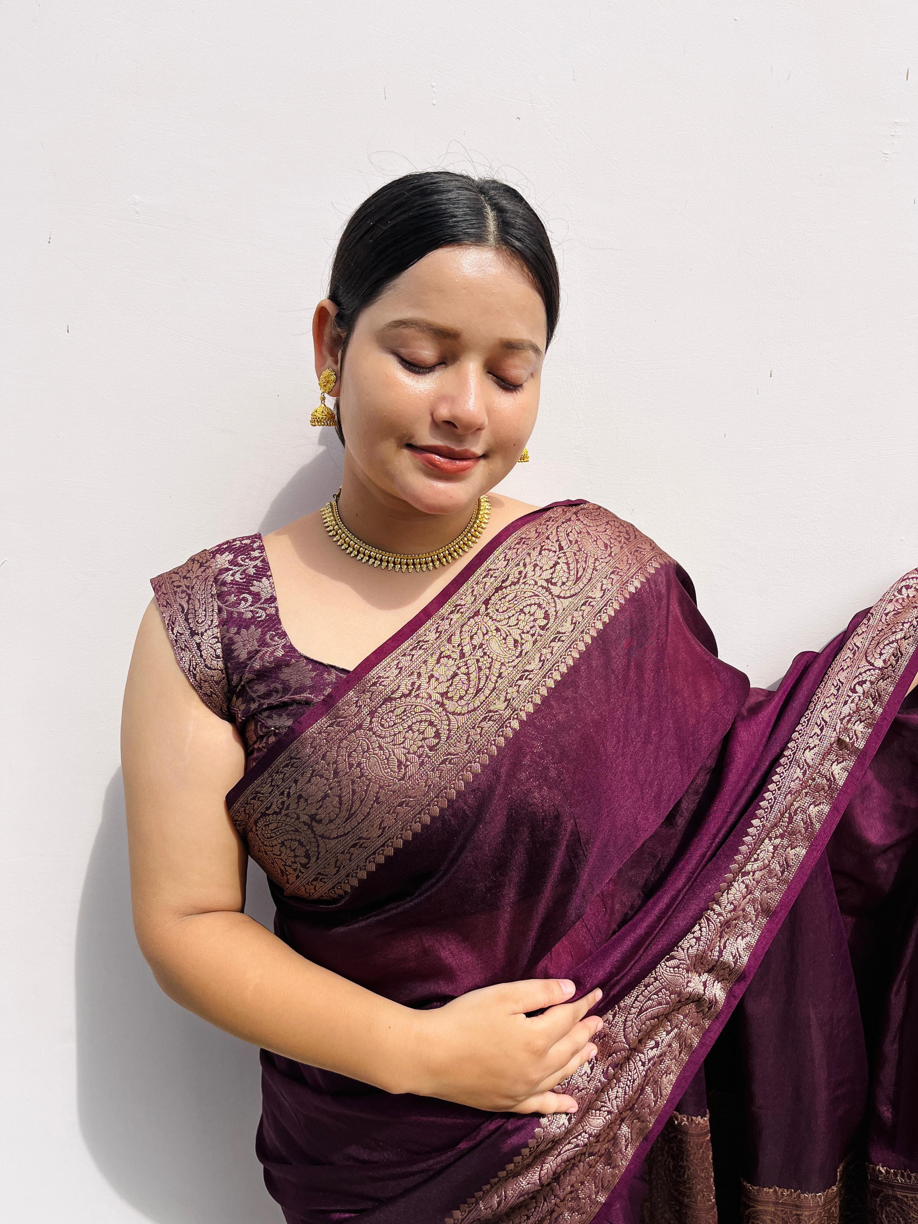 Magenta wine Classic Banarasi Woven Soft Saree with Antique Zari Borders