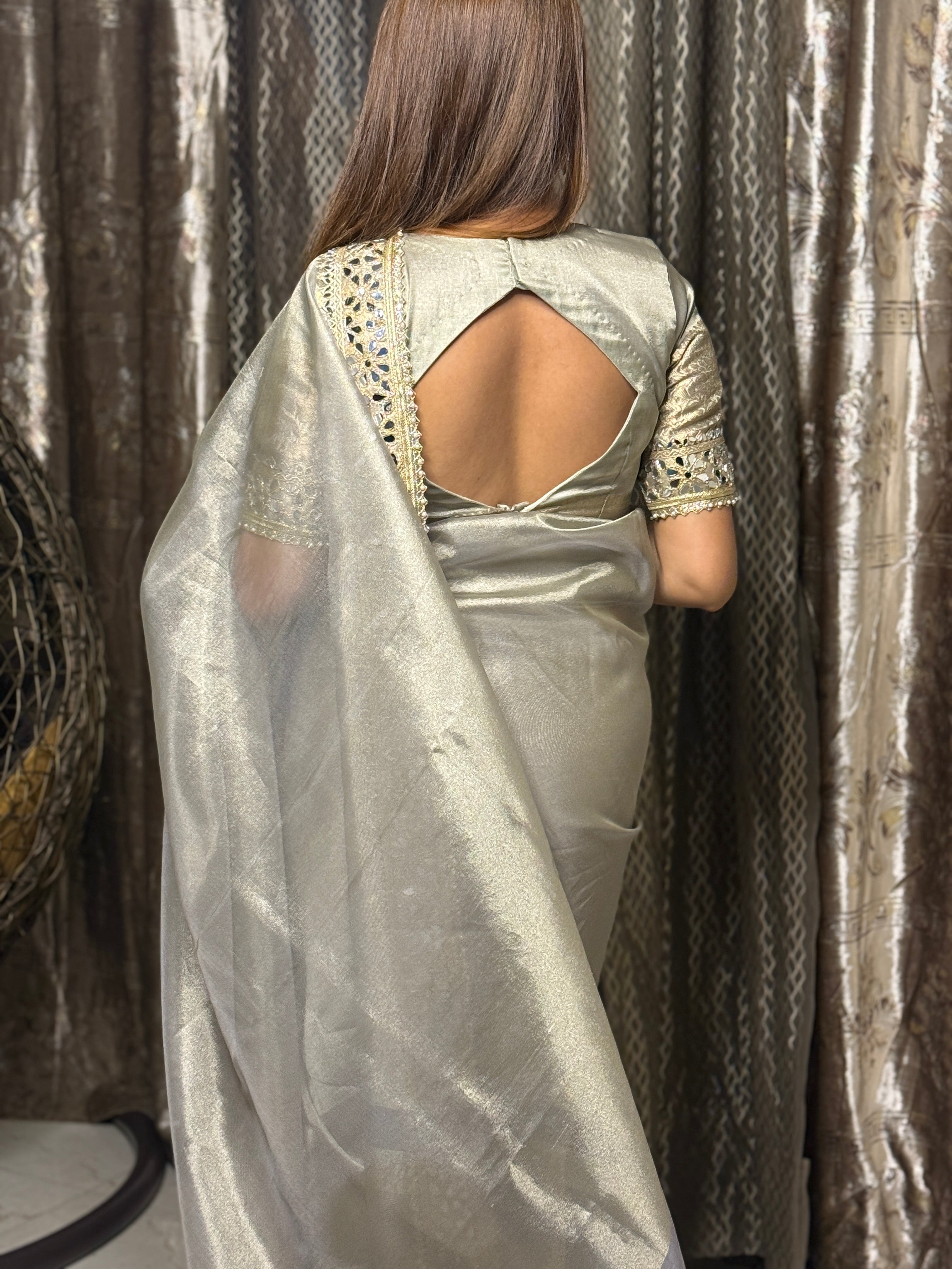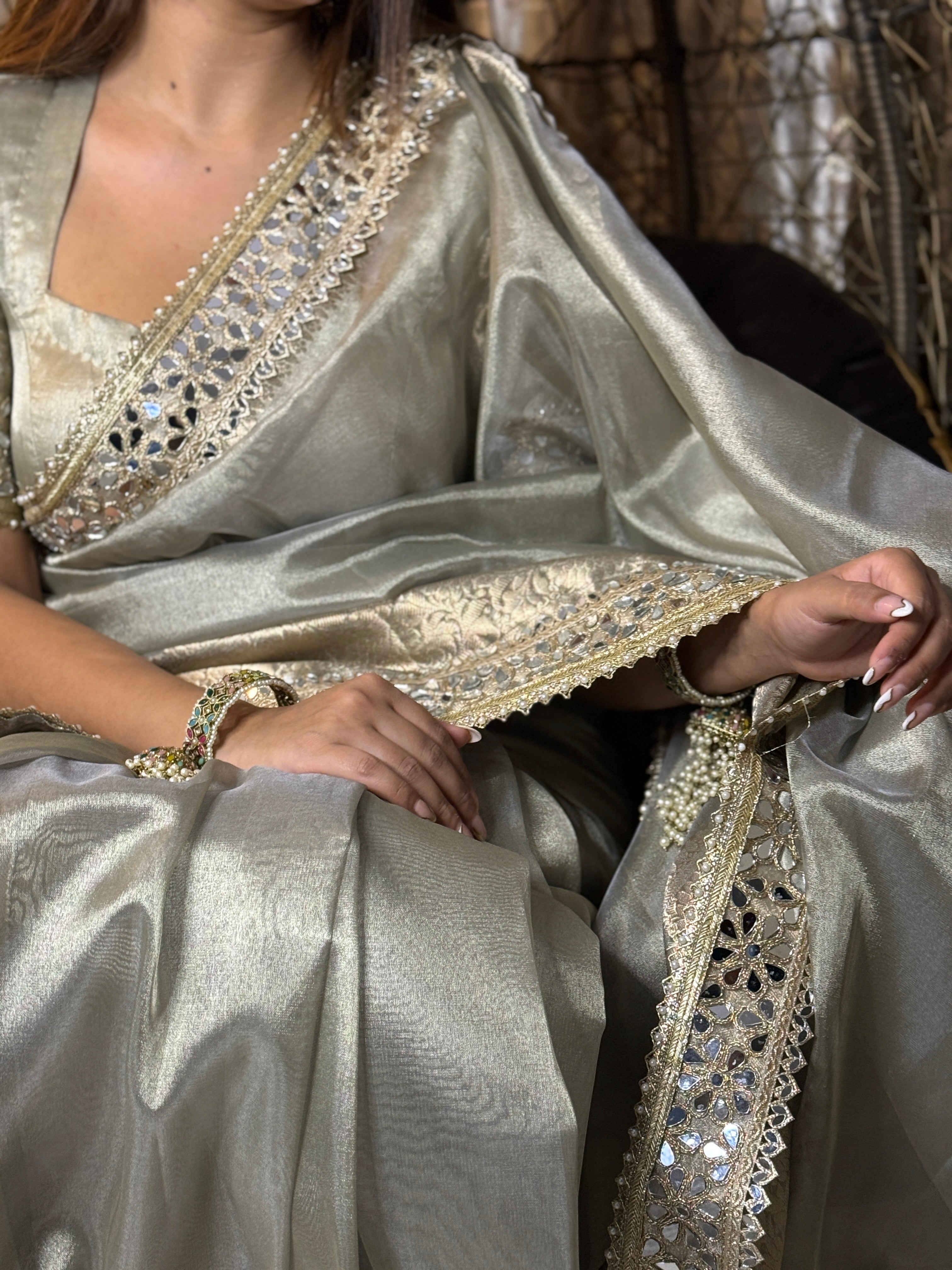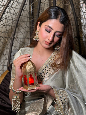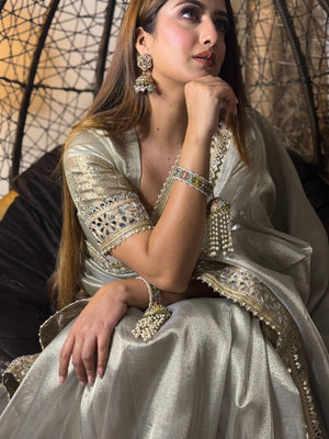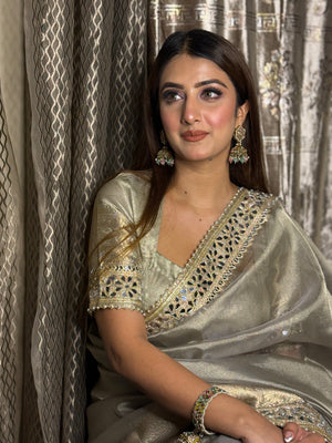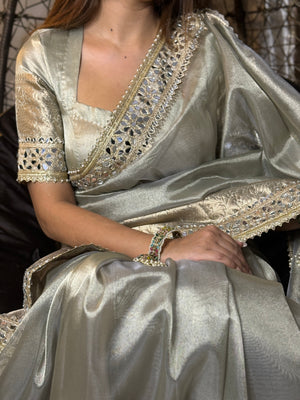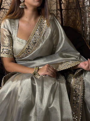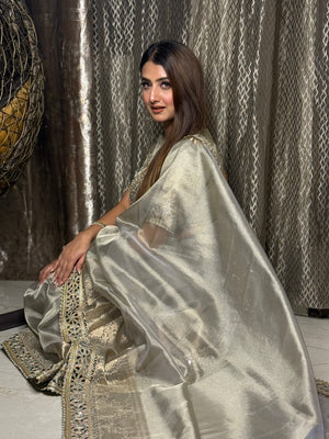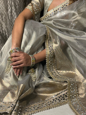 Moonlit Grey Banarasi Rajkumari Mirror Work Tissue Silk Saree