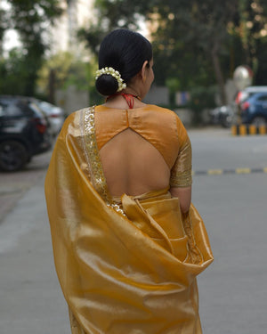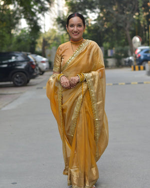 Macaroon Gold Designer Tissue Silk Saree with Hand Zardozi Work