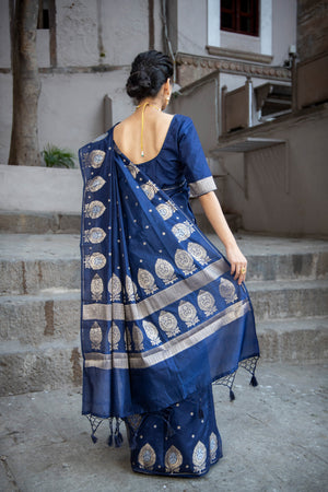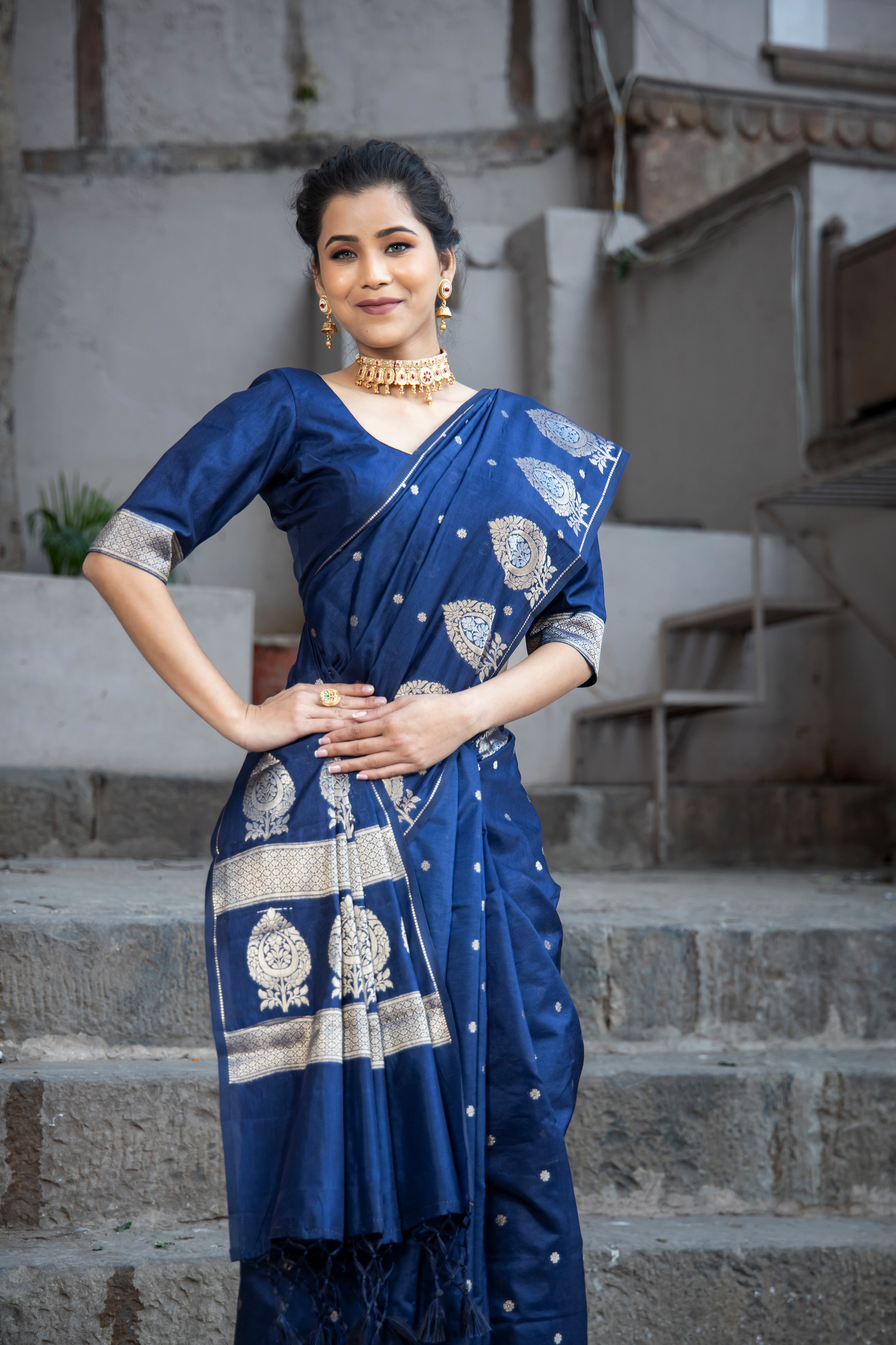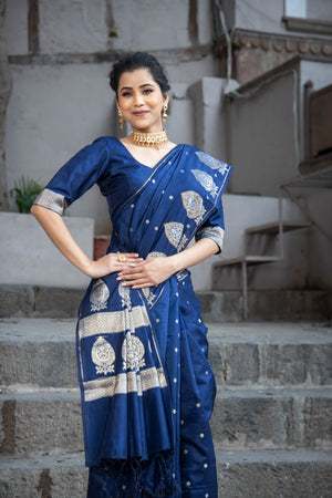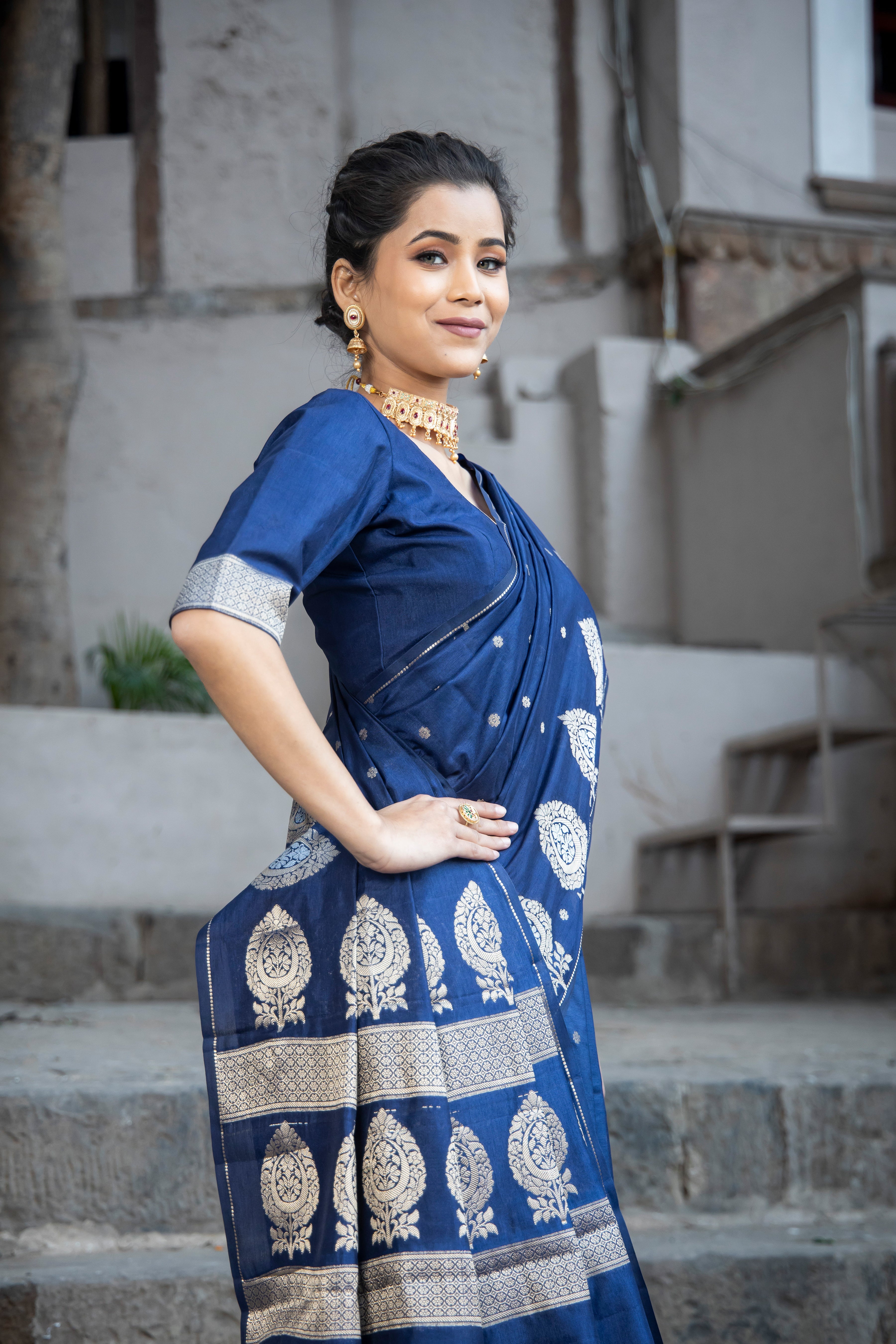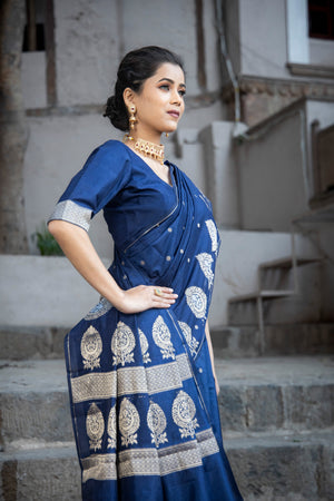 This Navy Blue banarasi saree is a masterpiece of artistry, adorned with intricate motif designs inspired by nature and mughal architecture. Delicate florals, paisleys, and boota patterns are woven with gold or silver zari, creating a luxurious tapestry. Each motif tells a story, reflecting timeless elegance and the rich heritage of Varanasi's weaving tradition."