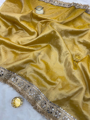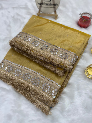 Noor-e-Zar Muted Gold Pearl Motif Handwork Saree with Mirror work Borders