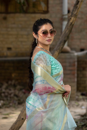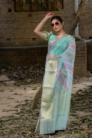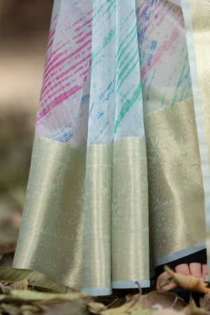 Off Blue Vibrant Organza Silk Saree with Mesmerizing Digital Print and Zari Border