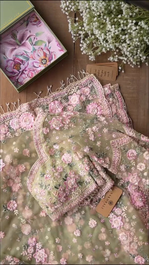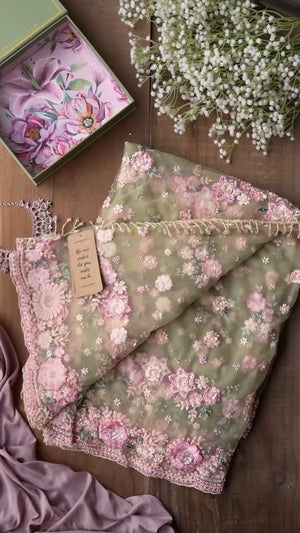 Pastel Green Floral Embroidered Organza Saree with Readymade Blouse