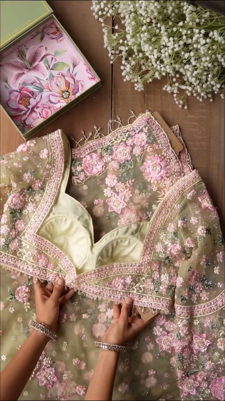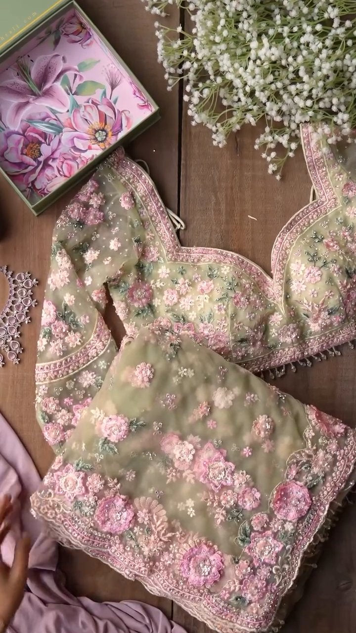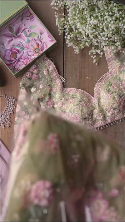 Step into fairytale elegance with this enchanting Pastel Green Organza Saree, adorned with delicate hand-embroidered floral motifs in soothing shades of blush pink, lilac, and sage. The saree is paired with a beautifully crafted readymade blouse, featuring intricate 3D threadwork, pearls, sequins, and scalloped lace borders that add a luxurious finish.