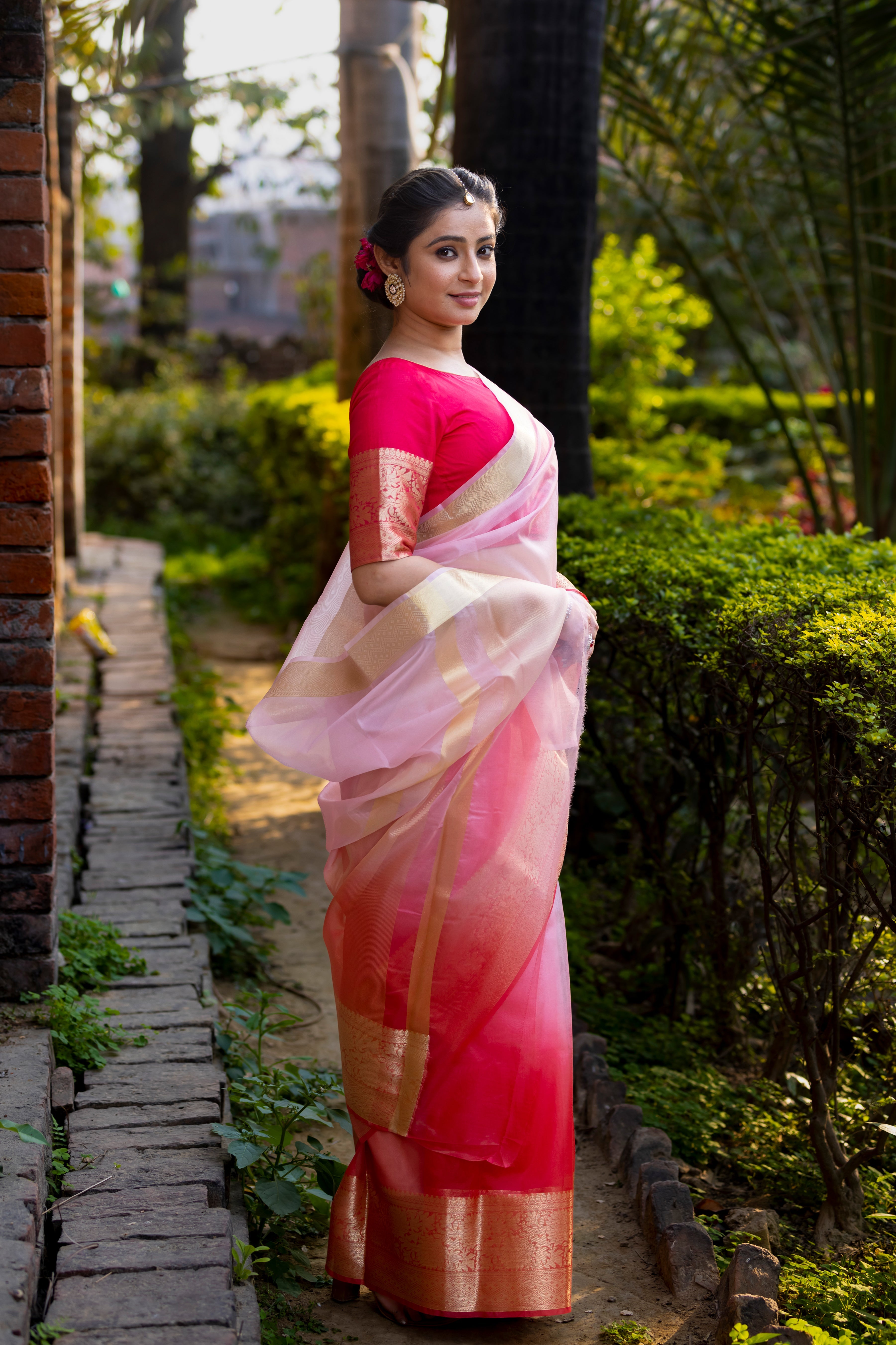 Step into a realm of soft organza where timeless tradition dances with contemporary flair. Our organza silk saree is a canvas of artistry, adorned with radiant golden zari borders that echo regal legacies, while bold colors ignite a modern vibrancy. Crafted for the woman who commands attention, this saree isn’t just worn—it’s experienced.