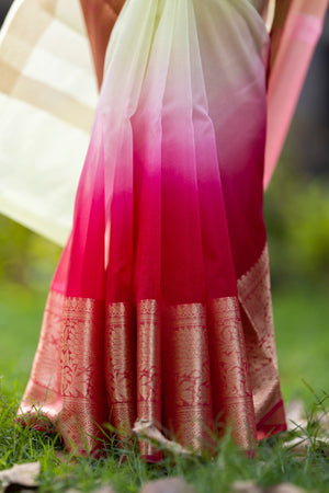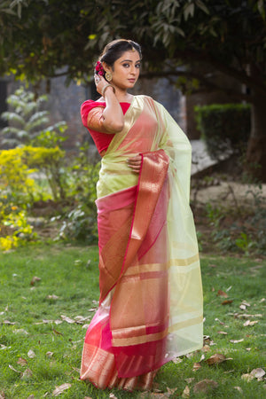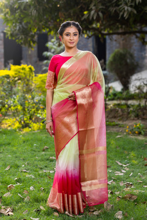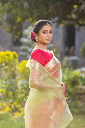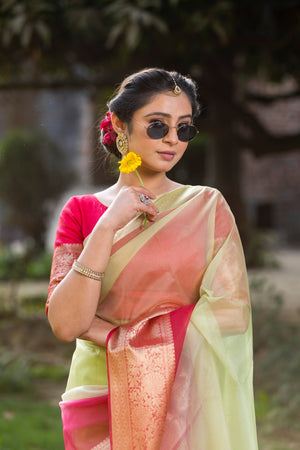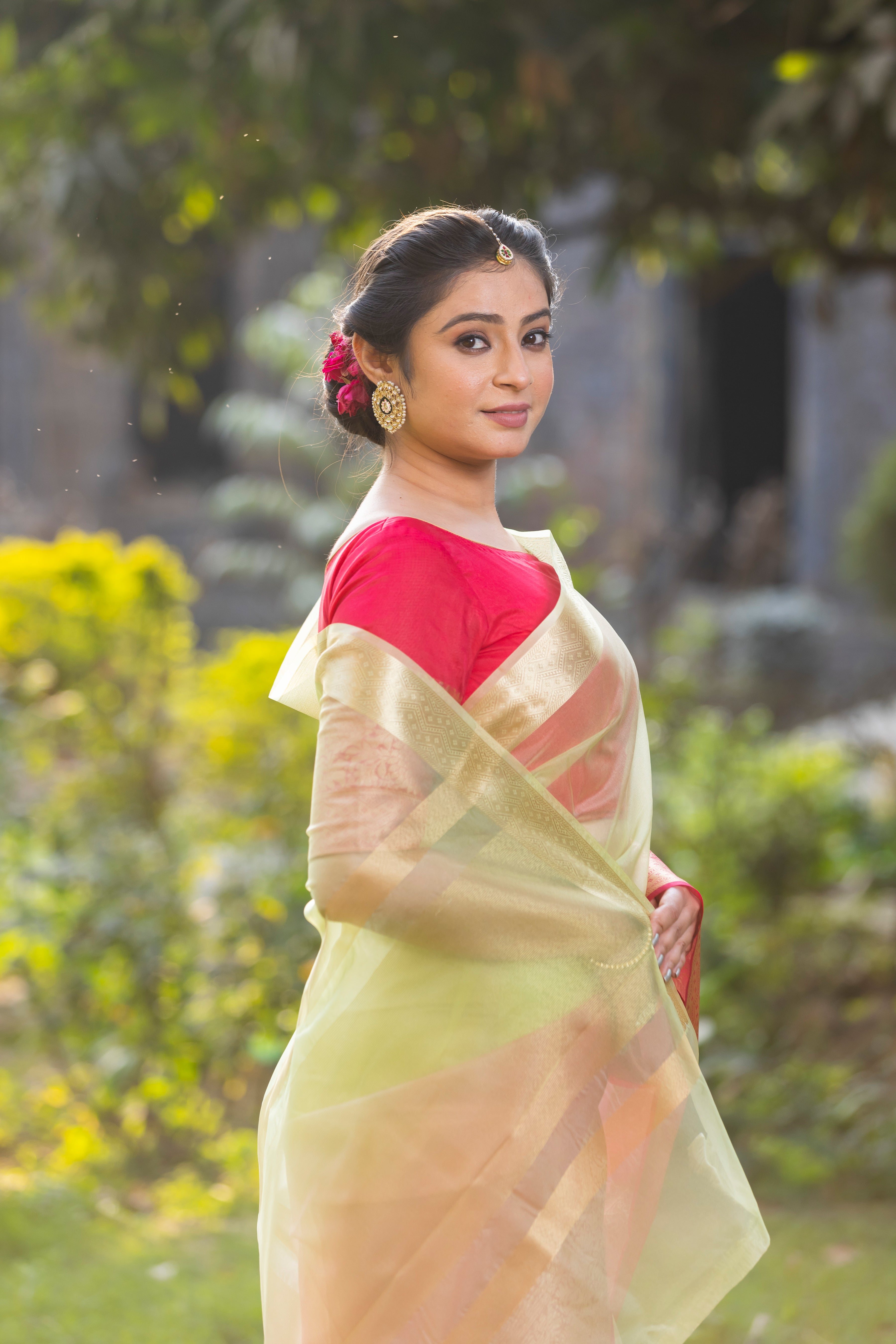 Step into a realm of soft organza where timeless tradition dances with contemporary flair. Our organza silk saree is a canvas of artistry, adorned with radiant golden zari borders that echo regal legacies, while bold colors ignite a modern vibrancy. Crafted for the woman who commands attention, this saree isn’t just worn—it’s experienced.