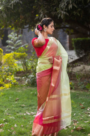 Rani Muted Green Banarasi Woven Soft Organza Skirt Border Saree