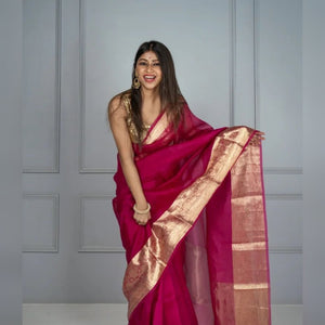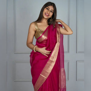Rani Pink Banarasi Woven Soft Organza Saree | Body Hugging Easy To Pleat Saree