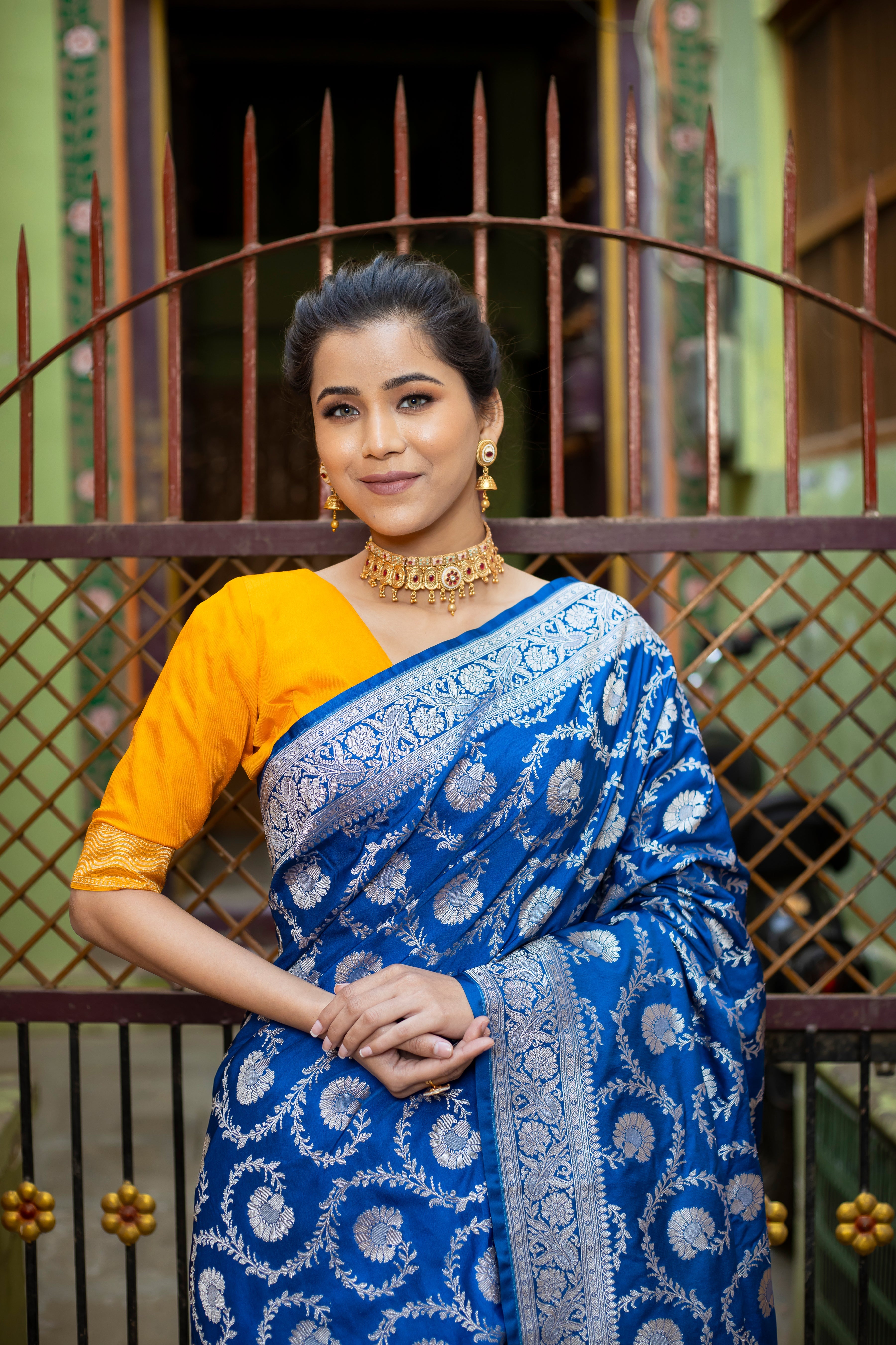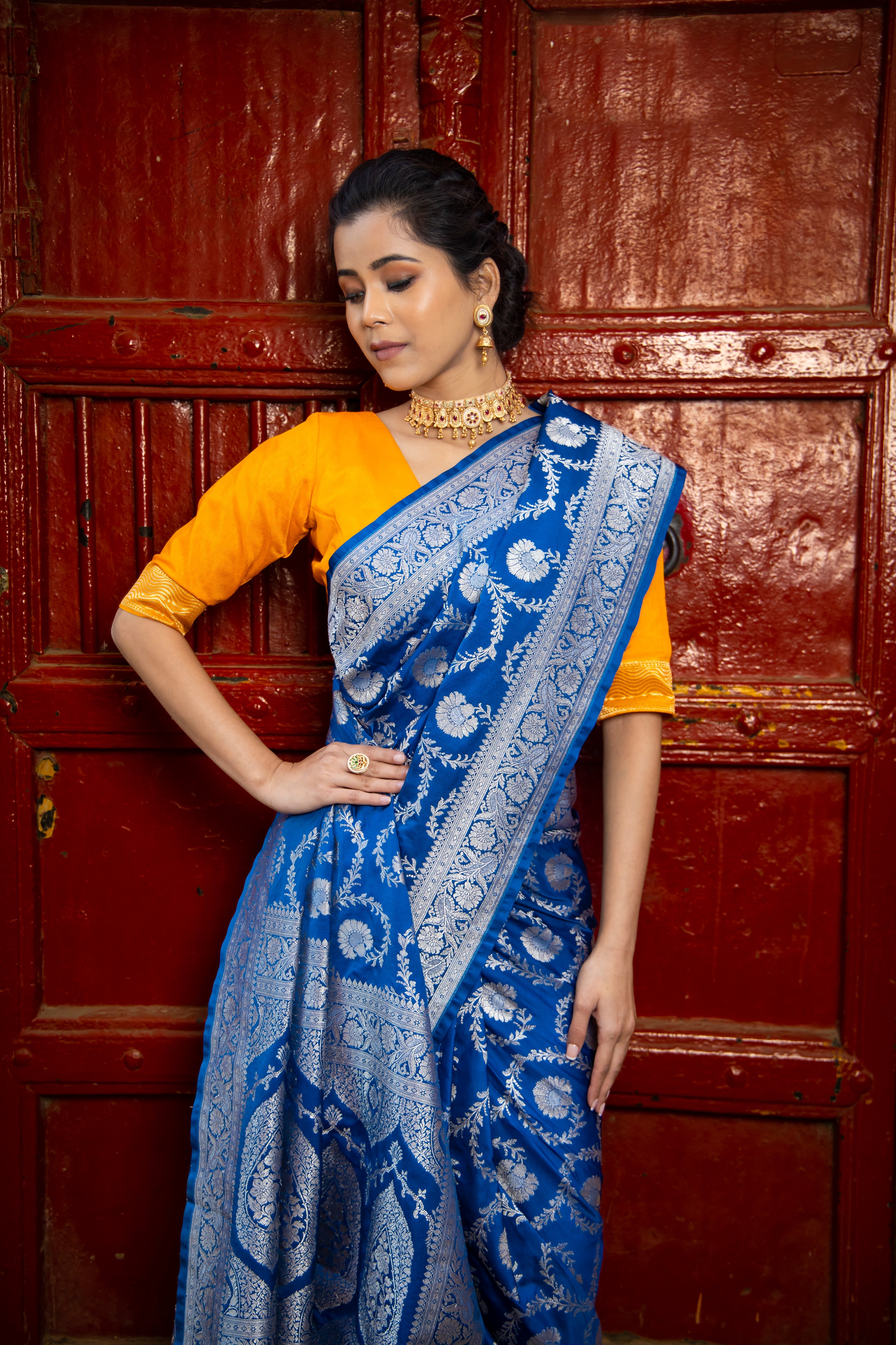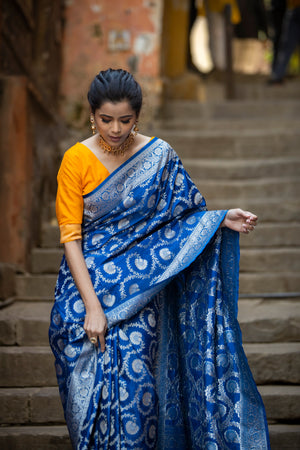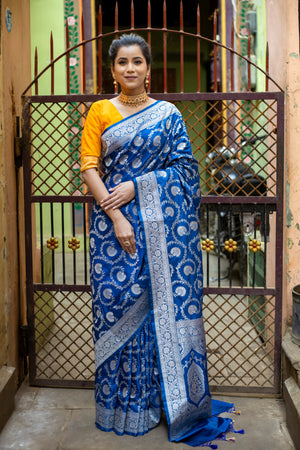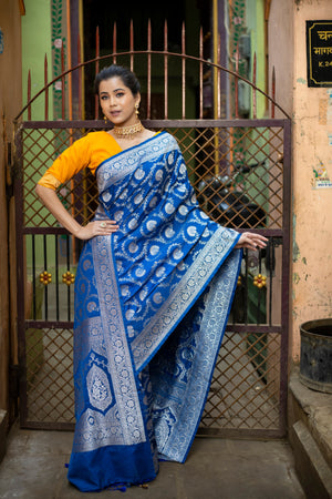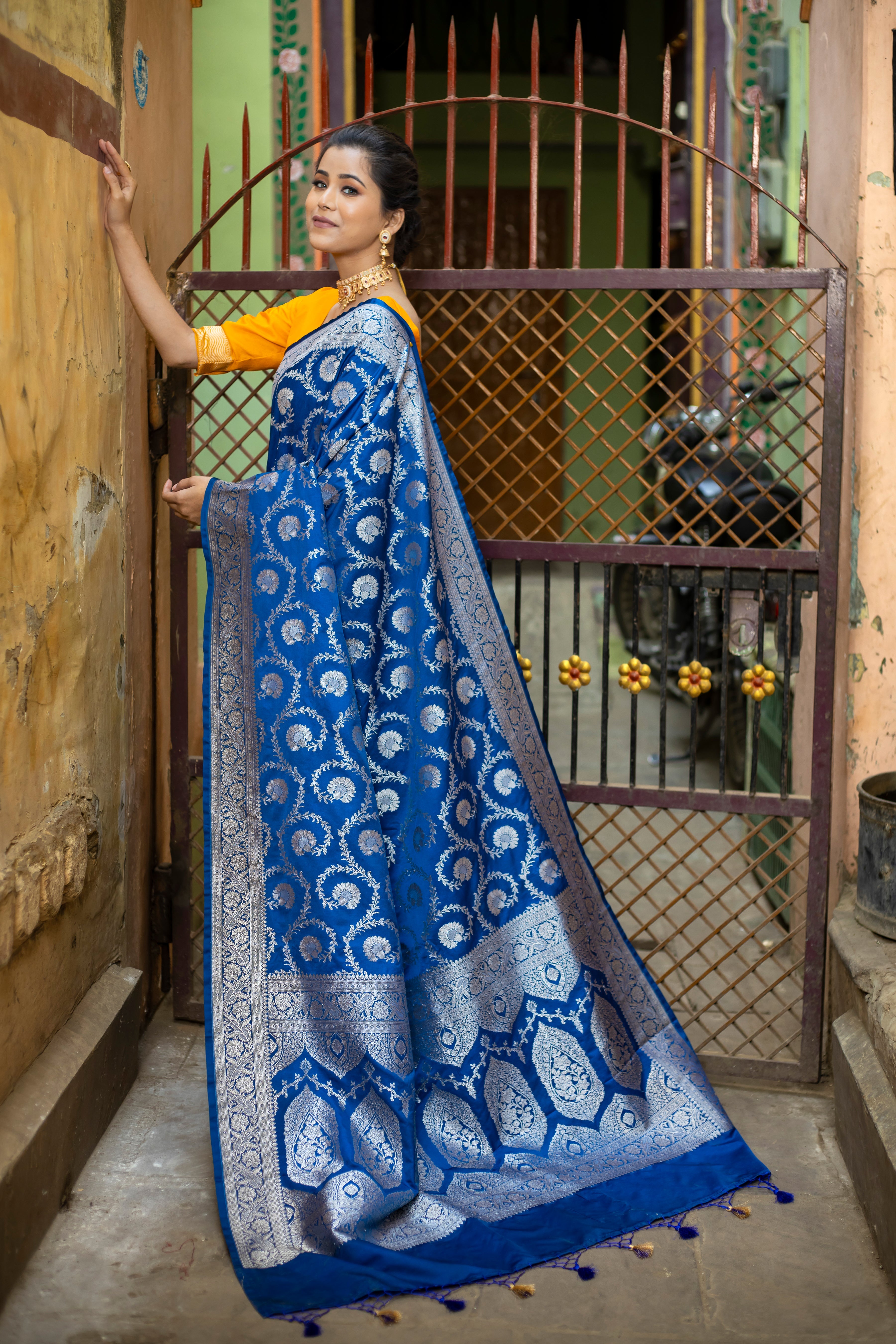 German Blue Floral Jaal Banarasi Mashru Silk Saree | Soft & Elegant