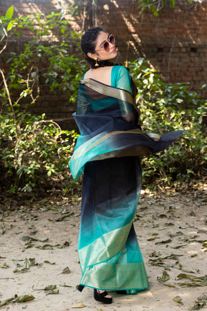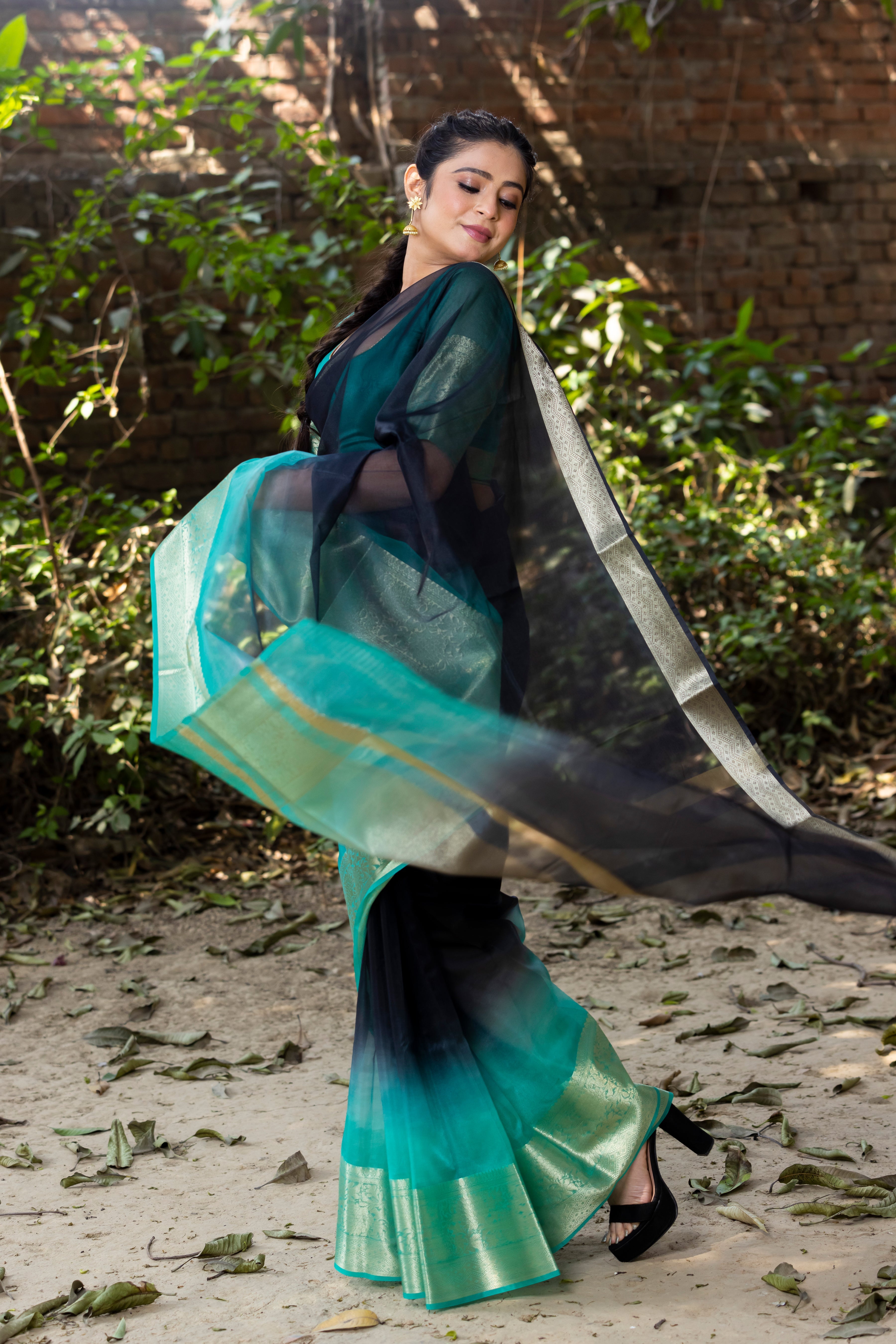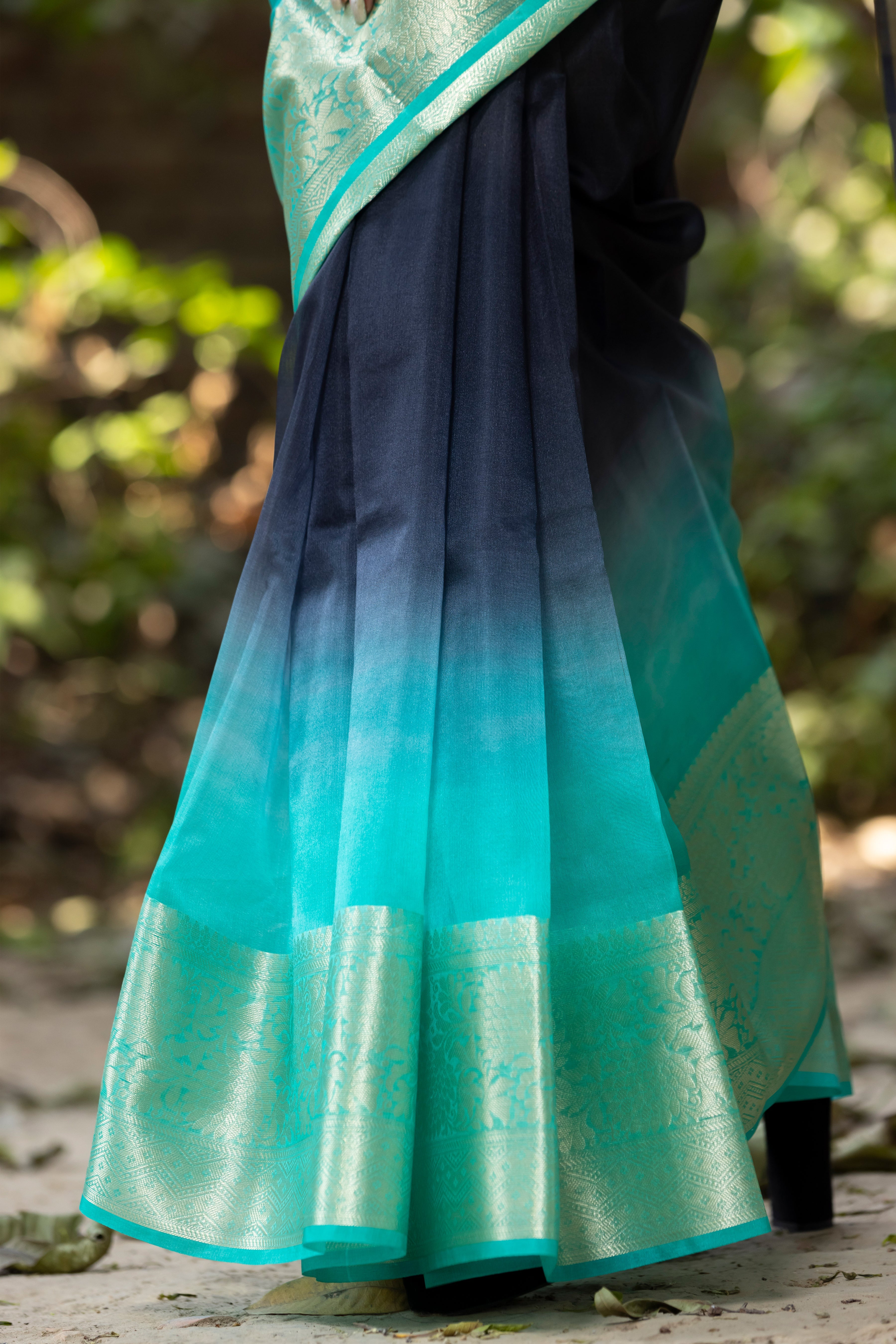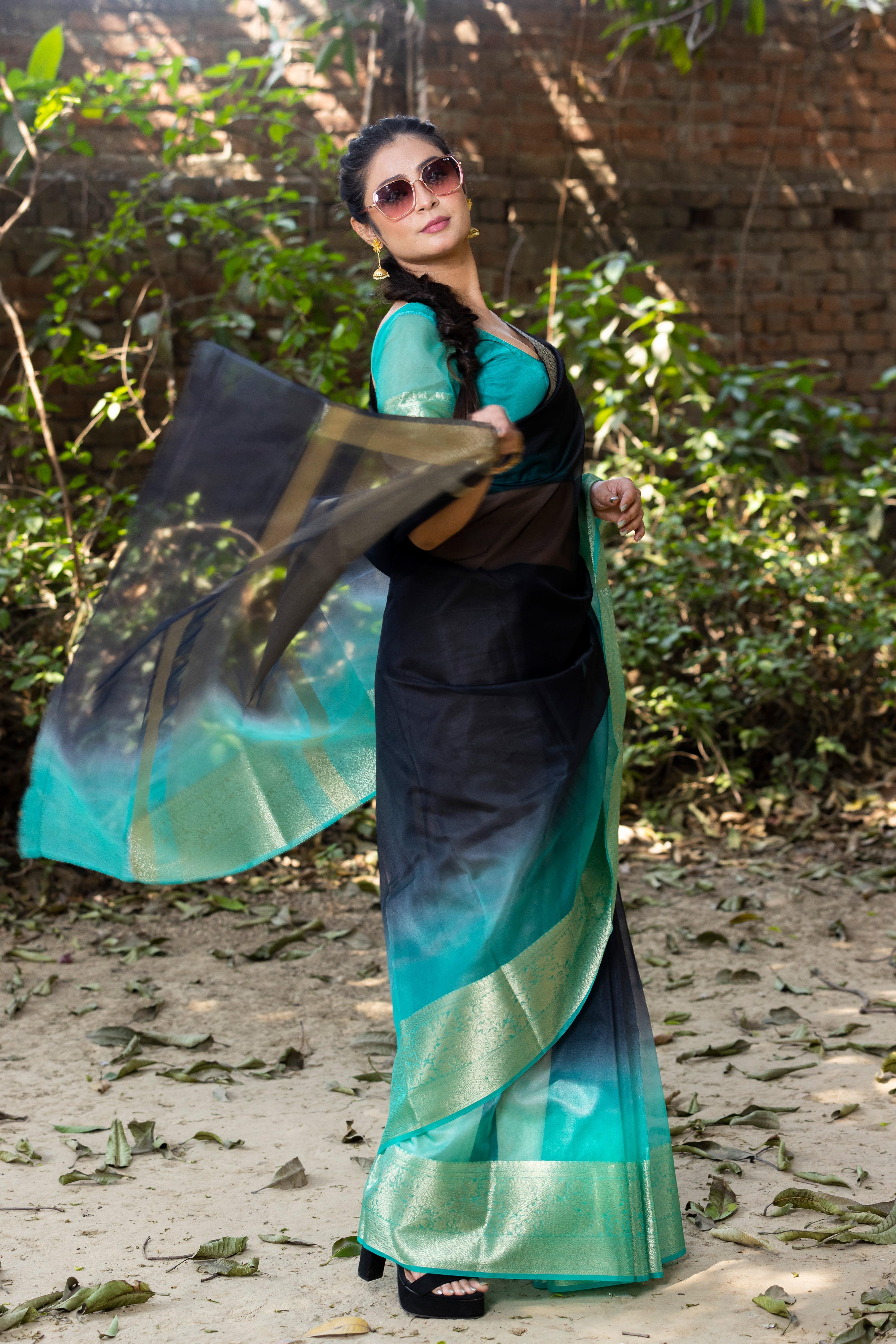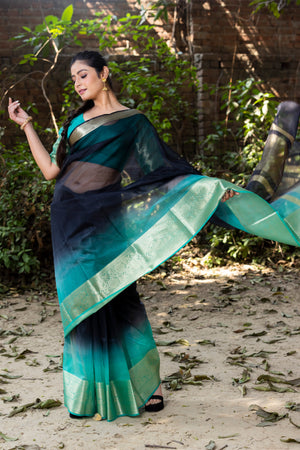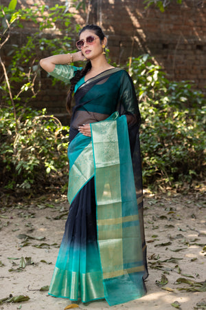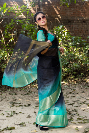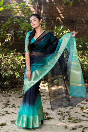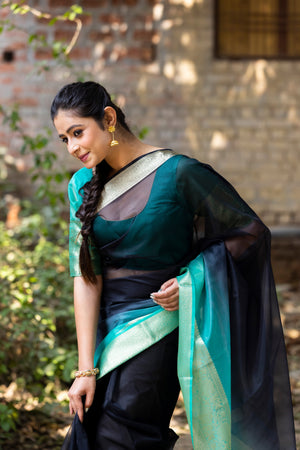 Sea Green Black Banarasi Woven Soft Organza Skirt Border Saree