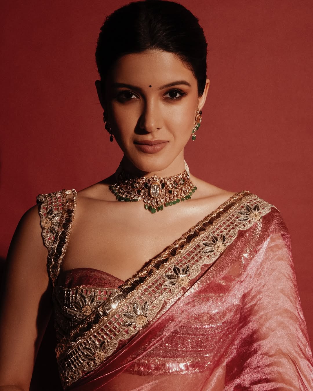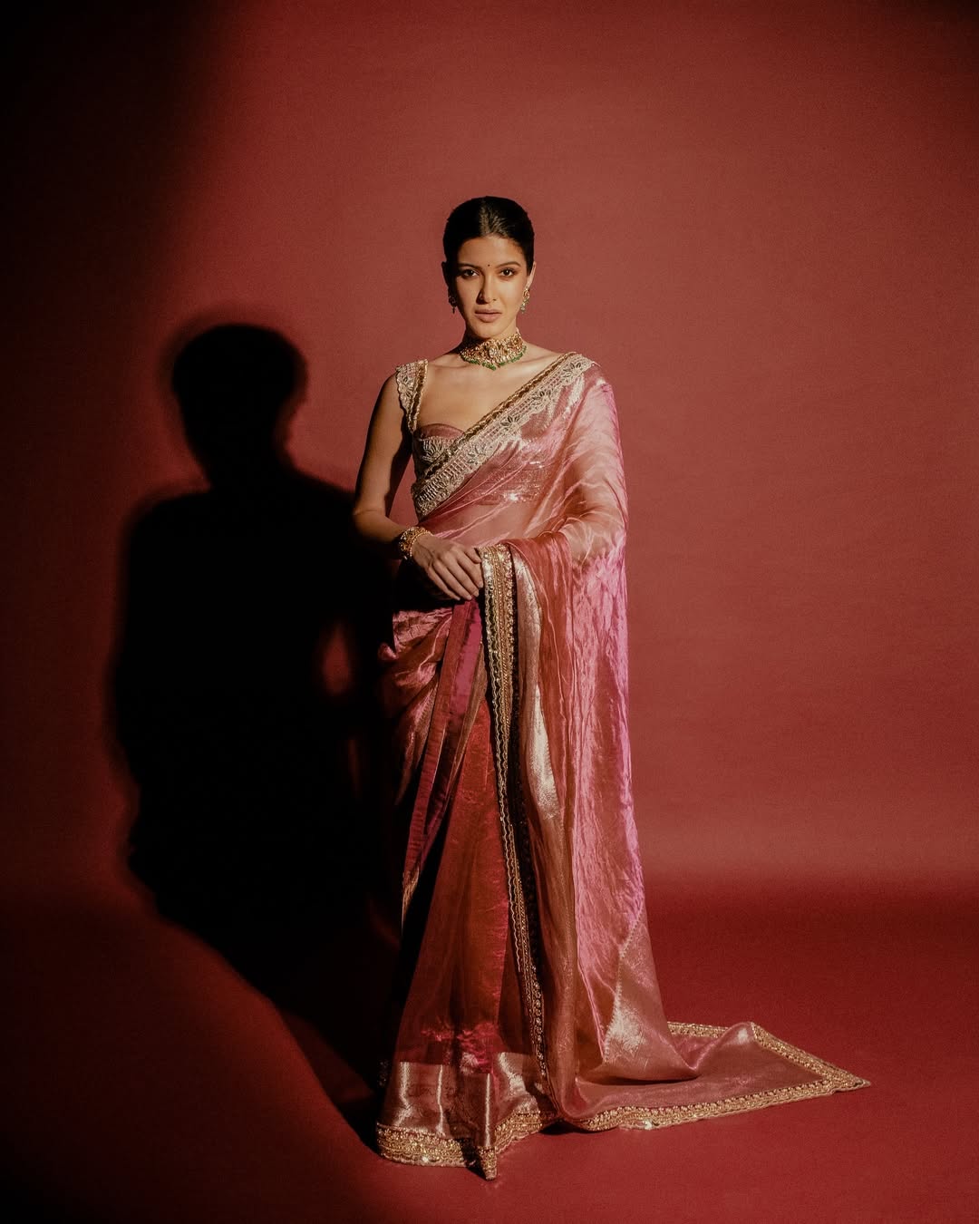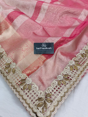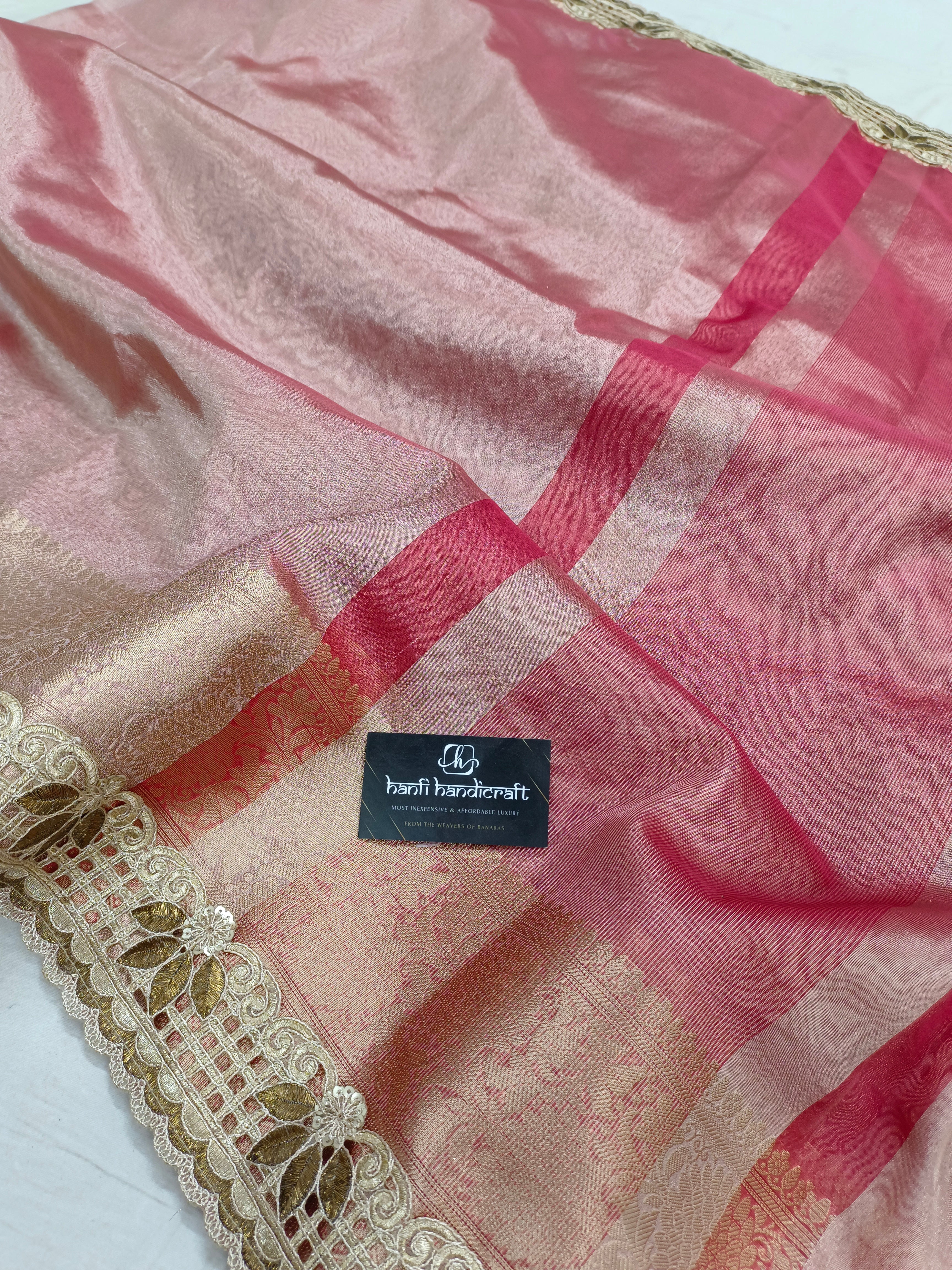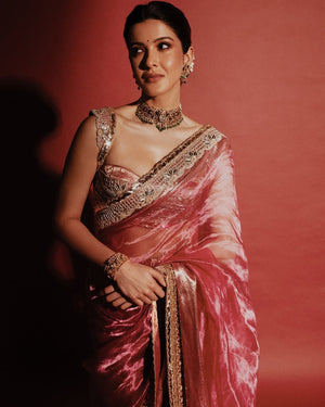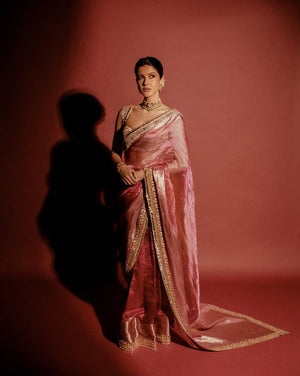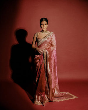 Shanaya Kapoor Inspired Strawberry Pink Soft Tissue Silk Saree with Zardozi Handwork Borders