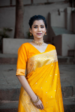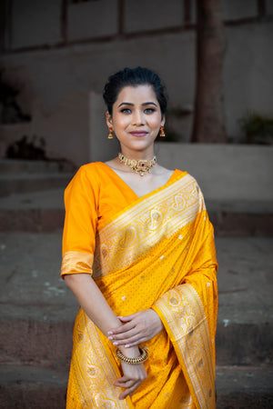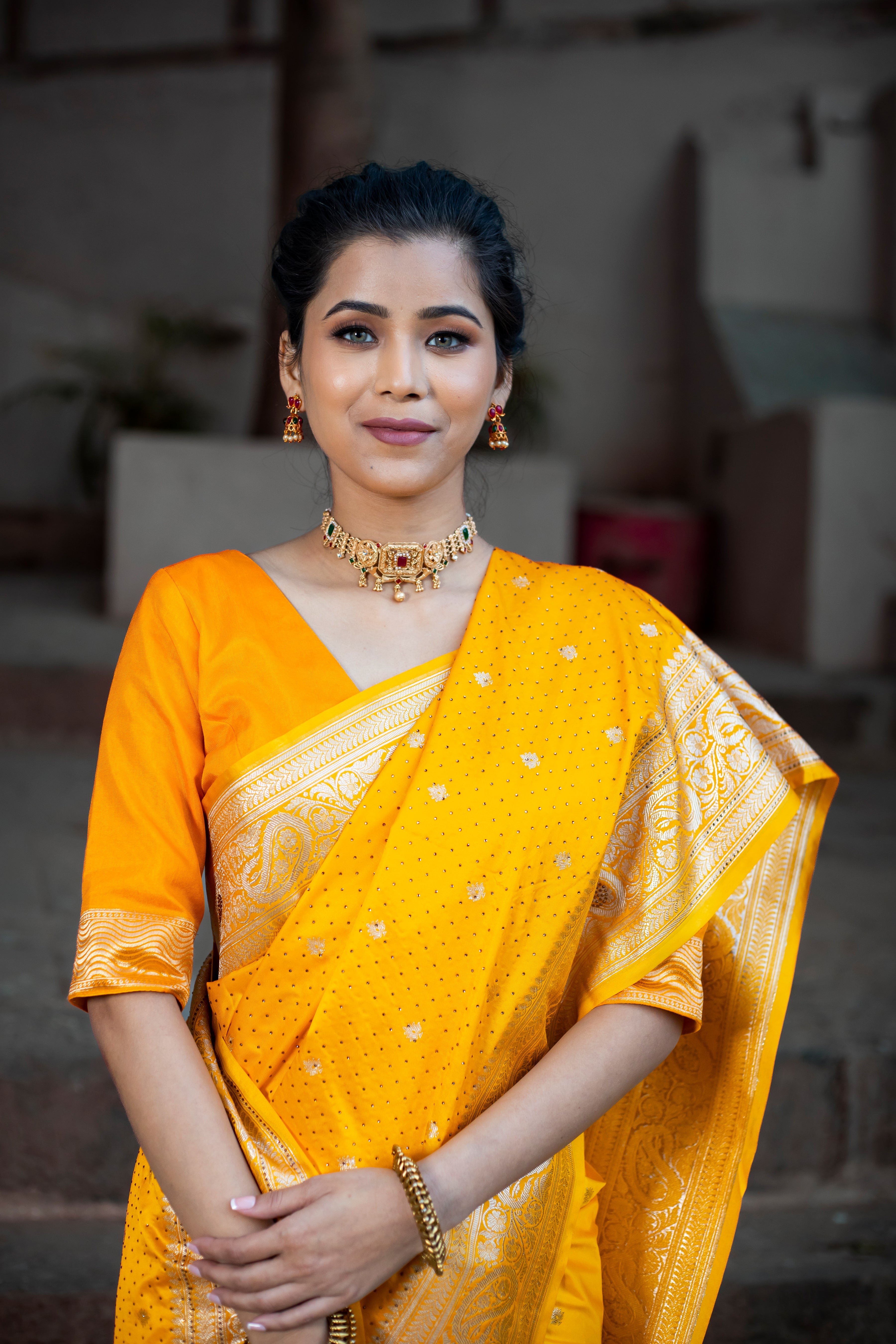 This Banarasi Mashru Silk Saree dazzles in a luxurious Yellow Golden hue, adorned with intricate stonework for a regal touch. Inspired by Siroski designs, its fine craftsmanship and rich texture make it a timeless piece of elegance and tradition.