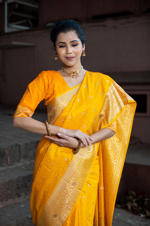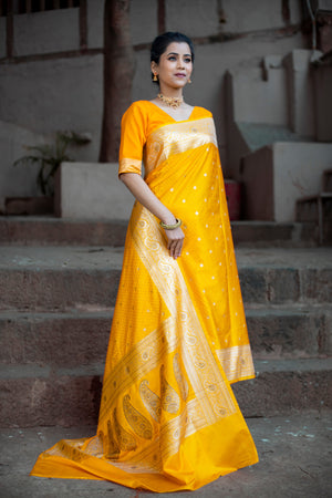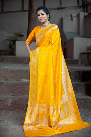 Yellow Golden Siroski Intricate Stone Work Banarasi Mashru Silk Saree